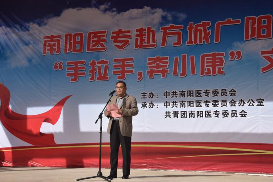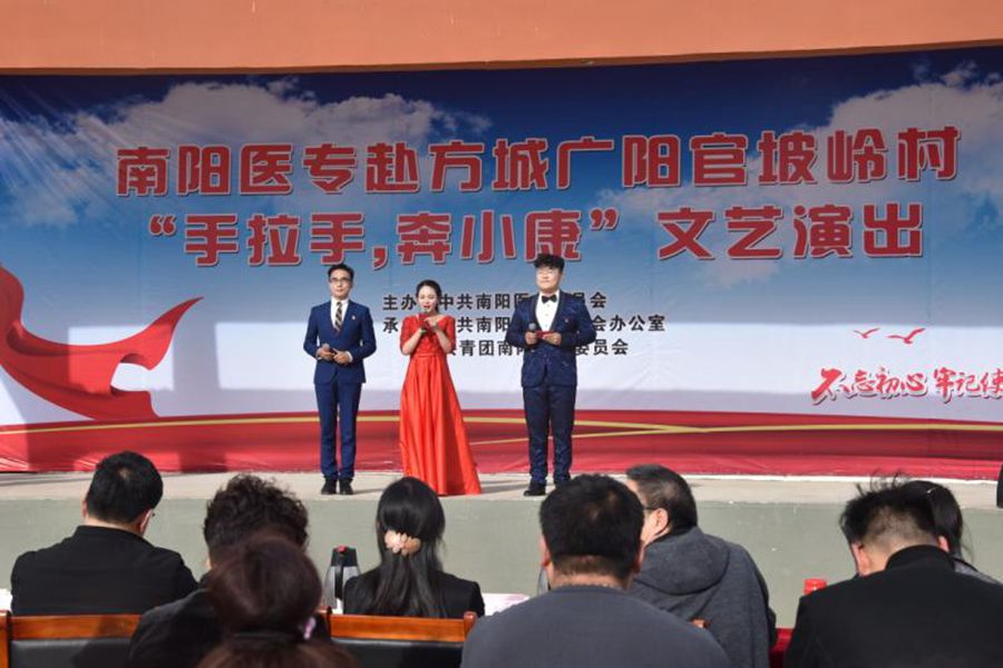 本网讯(文/宣传部 )11月13日,学校党委书记全新明、党委副书记逵应坤带领学校“手拉手、奔小康”文艺演出团到方城县广阳镇官坡岭村进行文化下乡演出。学校相关处室的负责人、驻官坡岭村工作队队长第一书记卢朝彬、学校部分文艺专家、教师、学生参加了活动。方城县副县长董玉坤、广阳镇党委书记陈万萍莅临现场。