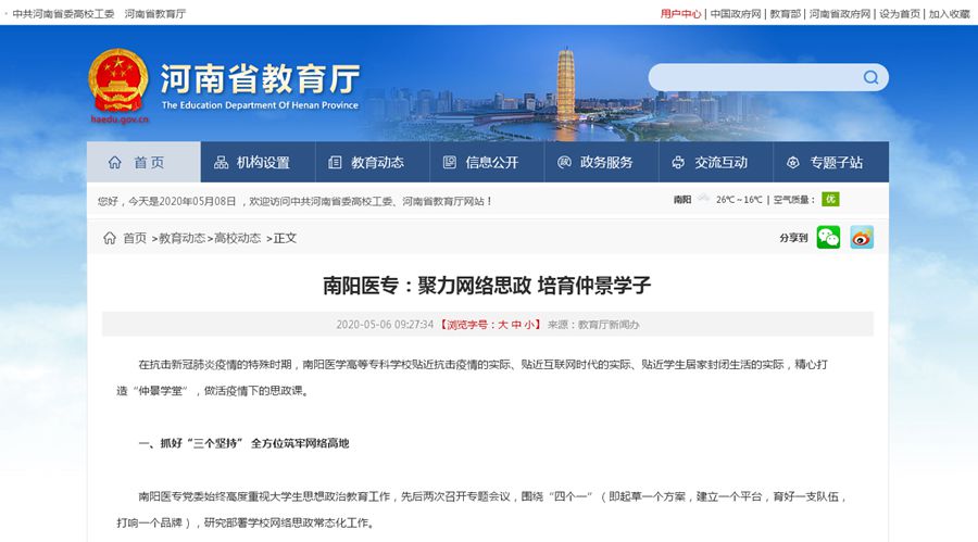 本网讯(文/宣传部 张旭斌)5月6日,省高工委、省教育厅网站推出专题新闻“聚力网络思政 培育仲景学子”,介绍多盈手机在线登录抓好“三个坚持”、着力“三个保障”、推进“三个建设”的网络思政建设工作经验(http://www.haedu.gov.cn/2020/05/06/1588728501465.html)。