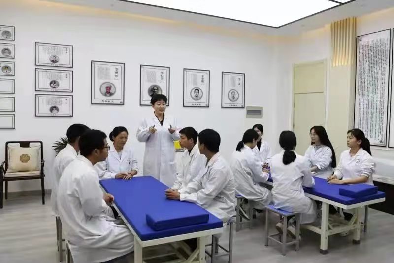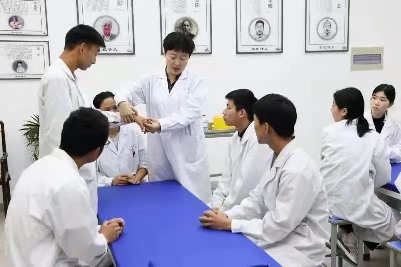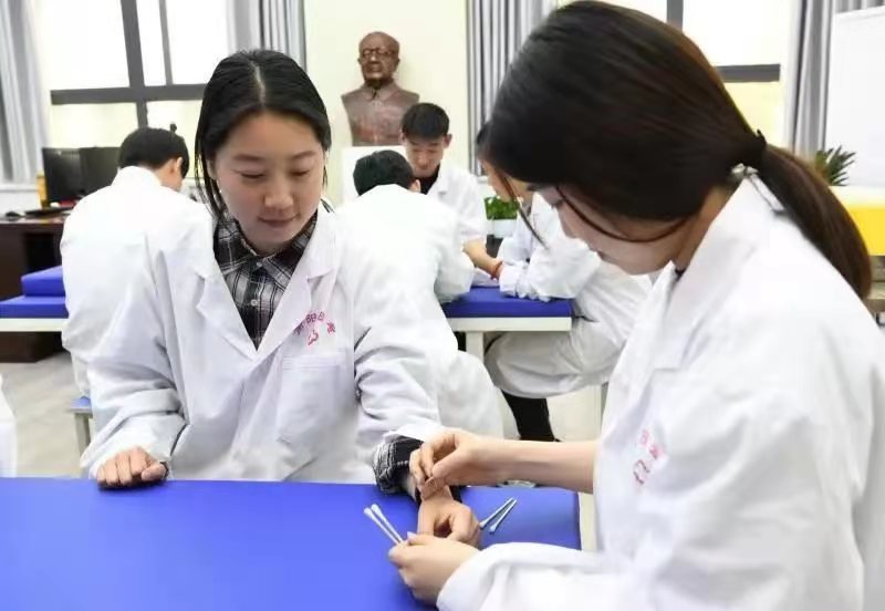 在多盈手机在线登录,当地李氏针灸流派的第17代传人潘华教授带领学生进行腧穴定位和毫针刺法的实训课程。