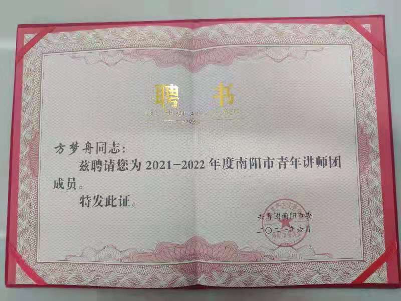 本网讯(文/校团委 古婵婵)6月27日,南阳市“学党史 强信念 展风采”青年理论宣讲大赛在梅溪宾馆会议室举行,多盈手机在线登录团委推荐的三位青年讲师在大赛中喜获佳绩:中医系刘元老师荣获一等奖,中医系方梦舟老师、药学系蒋晓涵老师荣获优秀奖。三位老师同时被共青团南阳市委聘请为2021——2022年度南阳市青年讲师团成员。