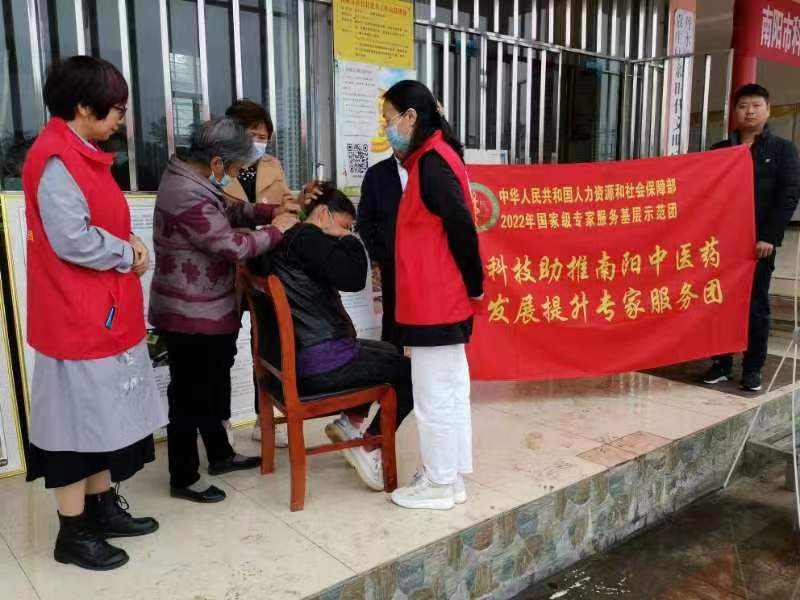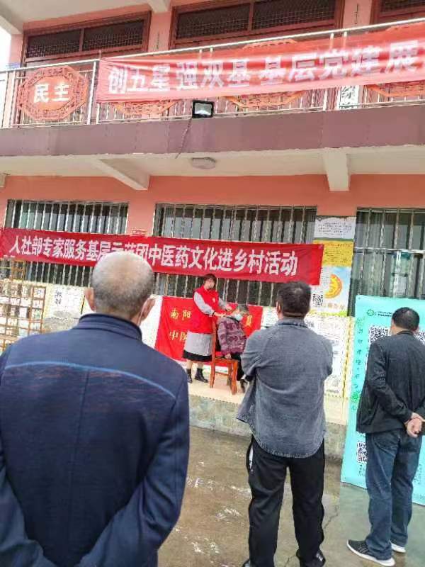 在西峡县丹水镇袁庄村开展义诊服务,专家服务团成员们测血糖、量血压,耐心回答乡亲们的咨询;传艾灸知识、授刮痧手法,精心培训中医实用技术;走村串户登门为行动不便的患者体检做心电图,并送去口罩、消毒液等防疫用品。专家服务团还开展了中医药文化进乡村活动,赠送了中药材标本、宣传板、教材、书架等中医药文化科普用品。