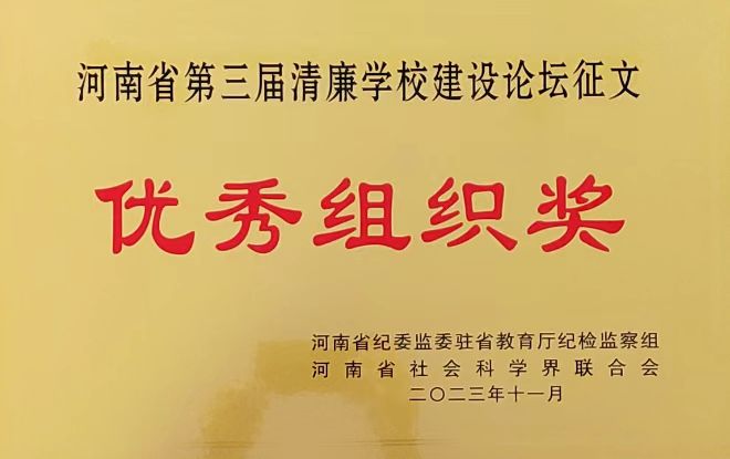 会议对论坛征文优秀组织单位和获奖论文进行表彰,校纪委书记刘金云代表学校领取“优秀组织奖”奖牌。校纪委张明坤荣获征文二等奖,并入选《河南省第三届清廉学校建设论坛优秀论文集》,口腔医学系孔祥坡、体育教学部樊璠、基础医学部马冬梅荣获征文三等奖。