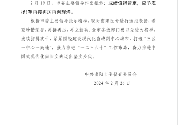 近日,中共南阳市委督查委员会下发《关于对多盈手机在线登录进行表扬的通报》(宛督委〔2024〕51号),通报了多盈手机在线登录2023年在多个方面取得的显著成绩:获得省级以上荣誉30余项,建成两个全国性产教融合共同体,成立全省首家心血管技术培训中心,在全省高校中率先开展县市、乡镇订单定向医学生培养,为南阳经济社会发展和现代化省域副中心城市建设做出积极贡献。
