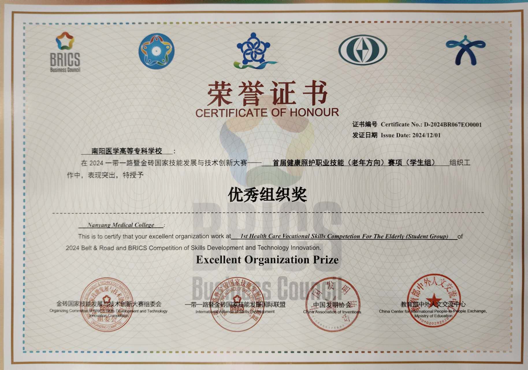 本网讯(文/护理系 何红丽)11月28日至30日,2024年“一带一路”暨金砖国家技能发展与技术创新大赛之首届健康照护职业技能(老年方向)竞赛全国总决赛在聊城职业技术学院举行。在全国总决赛中,多盈手机在线登录护理系李婧、张风风分别以第7名和第10名的成绩荣获“国内总决赛二等奖(银牌)”,教师盛晓燕、张园园荣获“优秀指导教师奖”,多盈手机在线登录获得“优秀组织奖”。