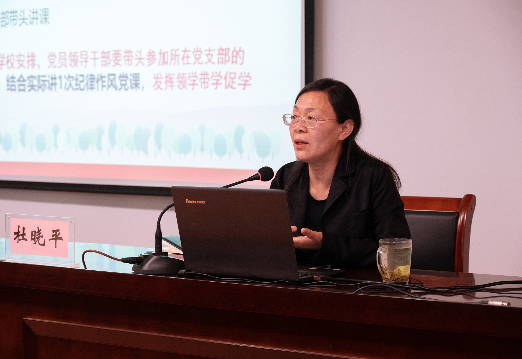杜晓平结合当下正在开展的深入贯彻中央八项规定精神学习教育,从学习教育背景、领会重要论述、贯彻八项规定三大方面展开讲解,深入阐述学习教育的整体规划、党的纪律和作风、贯彻中央八项规定等重点内容。她号召全体同志以中央八项规定精神为纲,守好立德树人初心,练就教书育人本领,担起为党育人、为国育才使命,为党的事业和学校的发展不断贡献力量。(编审 华俊皓)