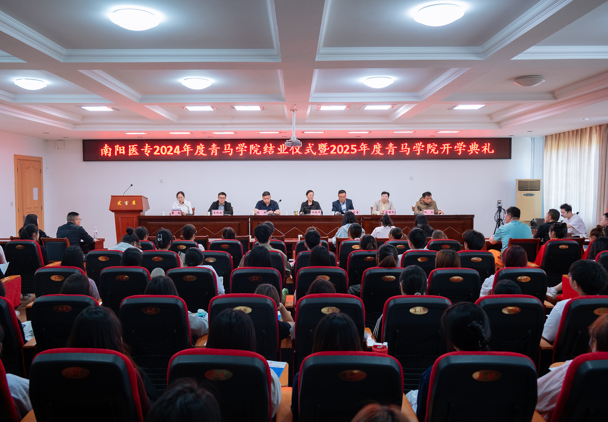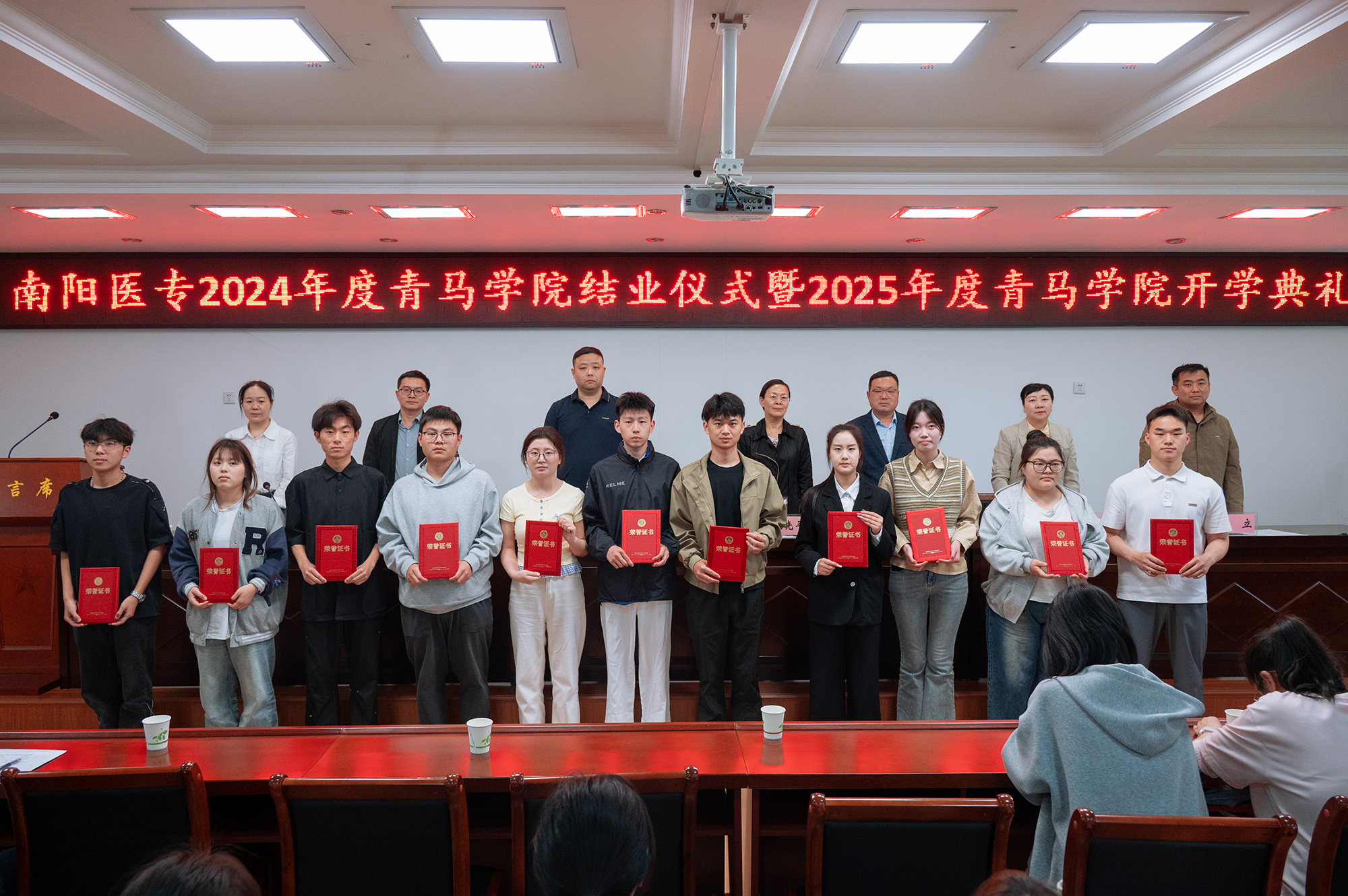 杜晓平为2025年度青马学院授旗,组织部长李红普、统战部长张博分别传达《关于南阳医专2024年度青马学院结业的通知》《关于举办南阳医专2025年度青马学院的通知》。与会领导为学员代表、优秀学员颁发证书。青马学院代表发言。