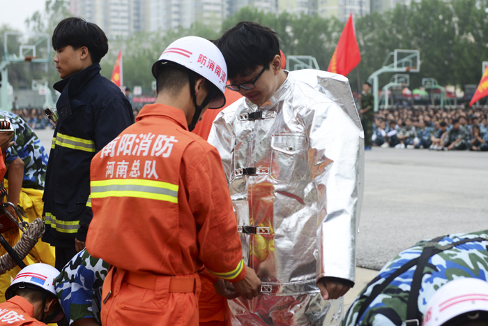 南阳市消防特勤中队于9月17日在主校区利用先进的设备、高超的技艺,开展了“孤岛救人”、“高空速降”、“器材展示”、“消防服装体验”、“灭火救援车操作”、“油槽灭火”等系列活动。南阳市卧龙消防大队19日上午在东校区对中专部新生进行了消防知识和逃生技能培训。