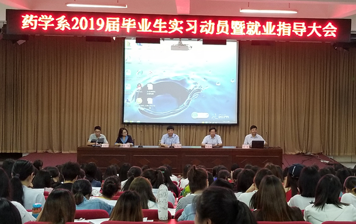 本网讯(文/药学系 孙丁贺)5月23日晚,药学系在新东区学术报告厅召开2019届毕业生实习动员暨就业指导大会。就业科科长张辉做报告,药学系党总支书记孙振国、副主任查道成,相关专业指导教师、辅导员及2019届毕业生参加大会。会议由药学系学工办主任金国柱主持。