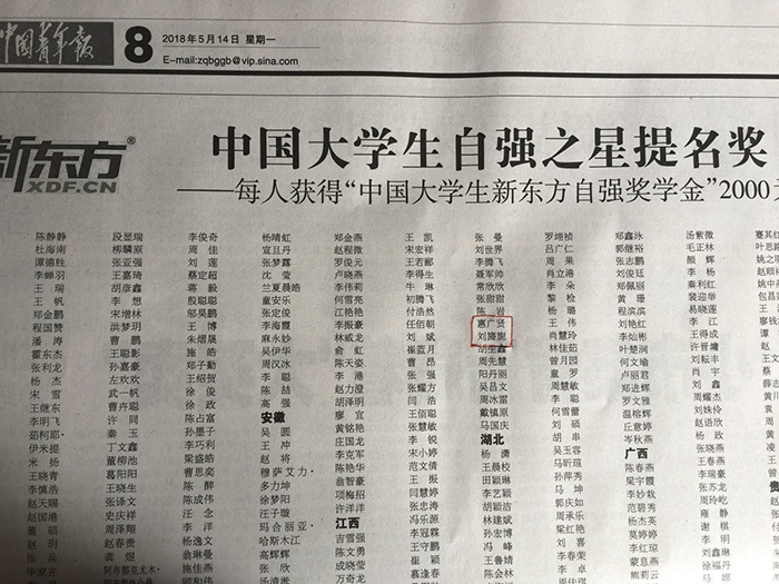 本网讯(护理系 闫珂)2018年5月14日由共青团中央、全国学生联合会主办的寻访2017年度“中国大学生自强之星”活动结果揭晓,护理系学生刘旖旎、惠广贤同学荣获2017年度“中国大学生自强之星”提名奖,并获“中国大学生新东方自强奖学金”,2017年度河南省共评选出63名学生,护理系学生已连续三年获此殊荣。
