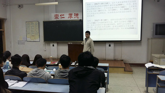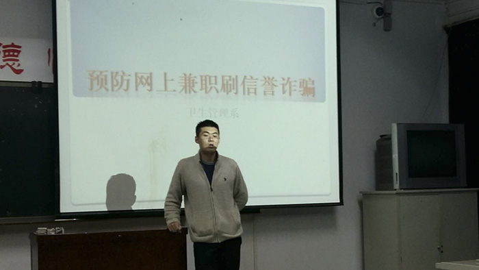 本网讯(文/卫生管理系 孔德贺)随着社会经济的发展,诈骗手段层出不穷,犯罪分子的手段也不断更新。为增强学生的防范意识,11月8日,卫生管理系在1号教学楼204教室举办了“预防网上兼职刷信誉诈骗” 专题讲座。本次讲座由卫生管理系辅导员李俊杰老师主讲。