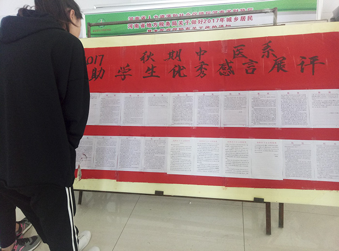 为了教育引导受助学生在感恩中继续前行,中医系要求所有获得奖助学金的同学亲笔书写获得资助的感想,受到资助的同学们都端正态度、认真对待,发自内心的书写了自己的感恩之情。此次活动使更多同学更加深切地感受到国家对困难学子的关爱以及社会的温暖,帮助他们坚定理想,提升了同学们爱国感恩的情怀,激发了他们学习的动力。同学们纷纷表示:将继续树立明确的学习目标,严于律己,为身边同学做表率,并将继续积极支持并参与学校开展的各项工作。