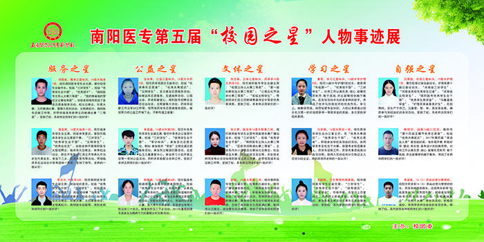 马舒佩、尤盼盼、龚亚辉、李浩东、张云梦、赵强、郎慧颖、单鑫淼、陈昭宇、李梁瑜等10名同学被被评为南阳医专第五届校园之星。