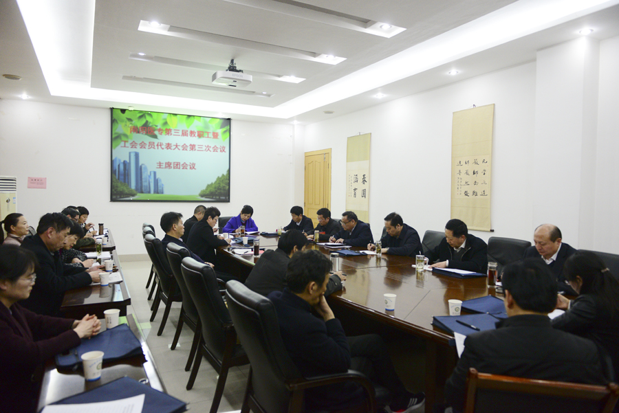 本网讯(文/校工会 朱东民)多盈手机在线登录第三届教职工暨工会会员代表大会第三次会议于3月24日在图书馆五楼报告厅隆重举行。校党委书记全新明、校长方家选以及逵应坤、张国良、张胜海、郭万周、田端、范真等校领导在主席团前排就坐,出席大会代表123人。会议听取、审议、通过了《学校工作报告》《工会工作报告》《南阳医专2018年度财务预算执行情况及2019年度财务预算报告》。