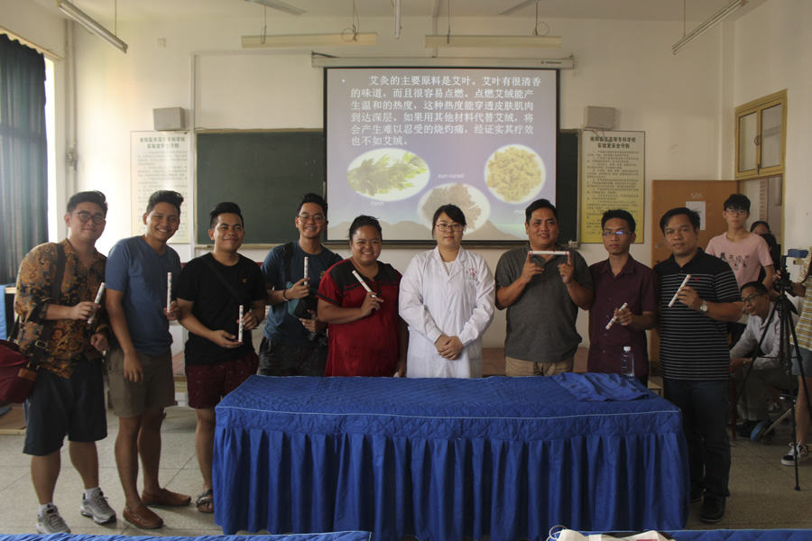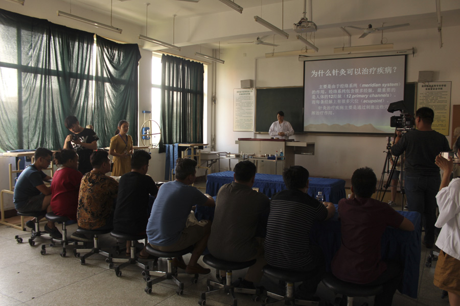 下午,在仲景西区1号教学楼505教室,针灸骨伤系赵丽娜老师为多盈手机在线登录合作院校来华交流师生讲授中医针灸,公教部杨天笑老师翻译。赵老师介绍了中医针灸知识,演示了如何扎针、拔针,耐心指点身体扎针部位。针灸课让交流师生见识了我国古老、神奇的针灸疗法,交流生表示十分向往学习针灸。