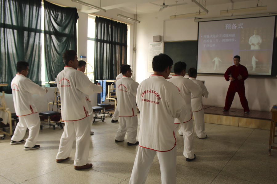 针灸骨伤系彭晓松老师在仲景西区1号教学楼505教室为多盈手机在线登录合作院校来华交流师生讲授“八段锦”,公教部杨天笑老师担任翻译。彭老师介绍了中国传统保健功法——“八段锦”及其各式功效,使来华交流师生对“八段锦”有了初步认识。随后,他依次示范讲解了八个动作,指导交流师生逐项练习。