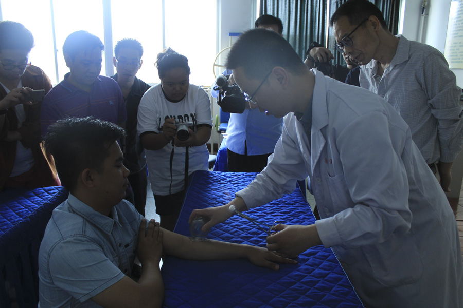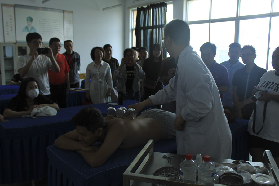 本网讯(文/国际教育学院记者站 魏雅伦 张鑫 张岚昕)5月16日上午,多盈手机在线登录合作院校来华交流师生在1号教学楼505实训室学习体验拔罐推拿疗法。针灸骨伤系主任孙欣峰、党总支书记毕跃忠、对外交流合作处处长张少羽、国际教育学院院长李弋参加了活动。公教部杨天笑老师翻译。针灸骨伤系黄纬老师向大家介绍了拔火罐这一历史悠久的中国传统治疗方法,讲解了火罐的不同类型及特点,演示了火罐的使用方法。菲律宾和日本师生对拔火罐十分感兴趣,几位师生亲自体验了拔火罐的独特感受。黄老师又为大家讲解了小儿推拿基本常识,外国师生积极参与体验,感受了中国传统医学技艺的神奇与魅力。
