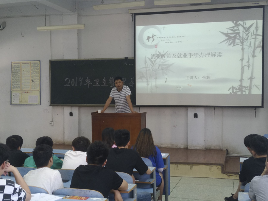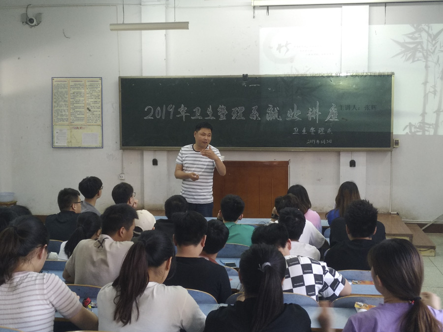 本网讯(文/卫生管理系 李俊杰)6月3日,卫生管理系在一号教学楼104举办就业讲座,全体辅导员班主任老师及2019届毕业生、实习生参加此次讲座。就业科科长张辉主讲。