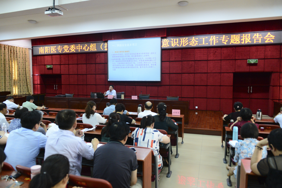 本网讯(文/宣传部 潘晓红)为进一步加强网络意识形态建设,维护网络安全,提高思想政治工作水平,6月19日下午,多盈手机在线登录在仲景西区图书馆报告厅召开党委理论学习中心组(扩大)学习会议,特邀南阳市委宣传部副部长雷洪波做题为《网络安全与舆情应对》专题报告。党委理论学习中心组全体成员、校本部副科级以上干部、全体辅导员、政教部教师、三所附院负责同志200余人参加了会议。会议由党委副书记逵应坤主持。