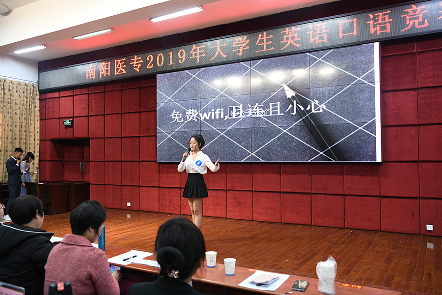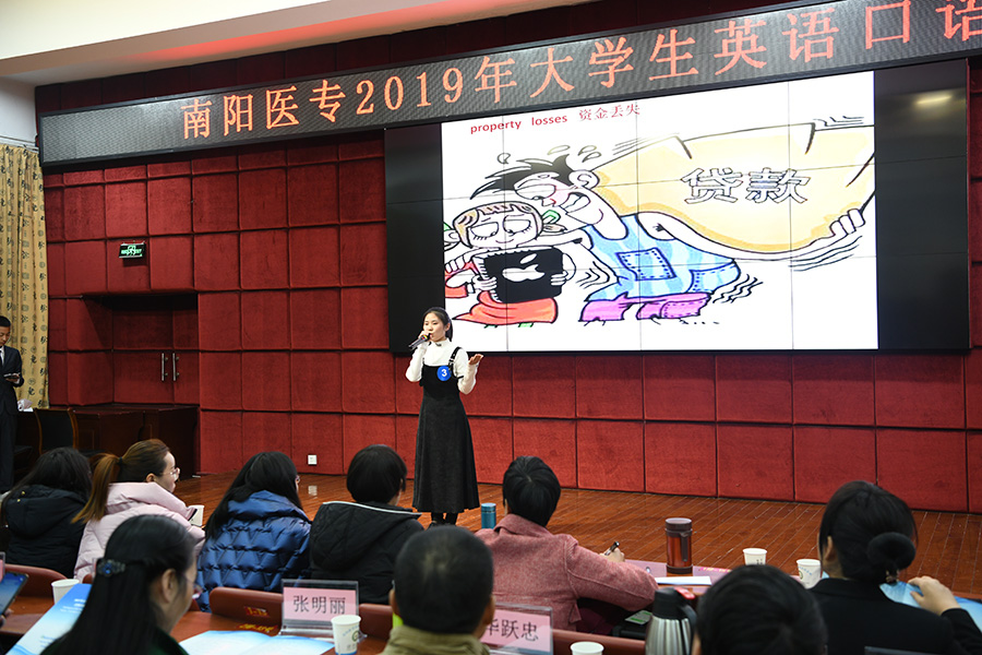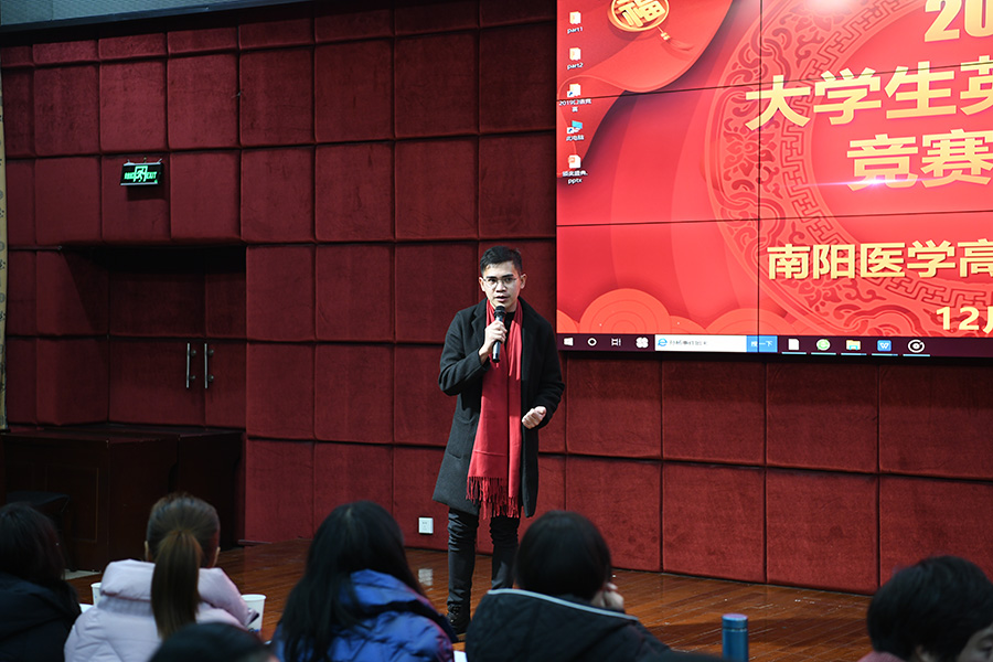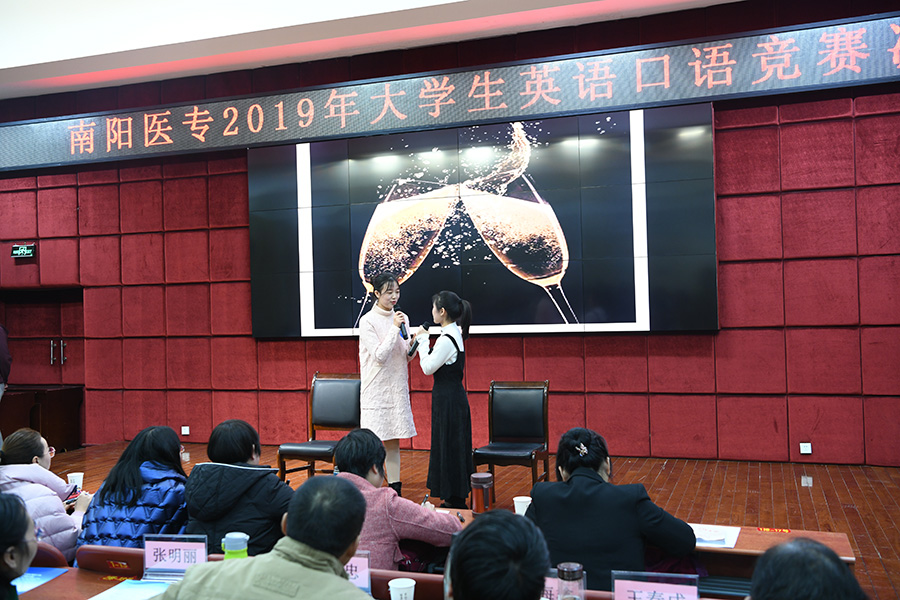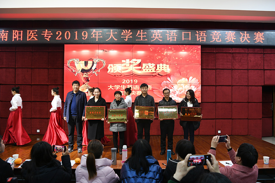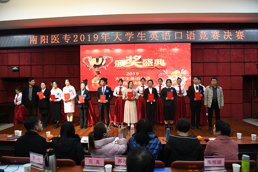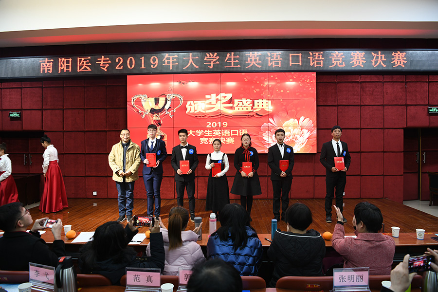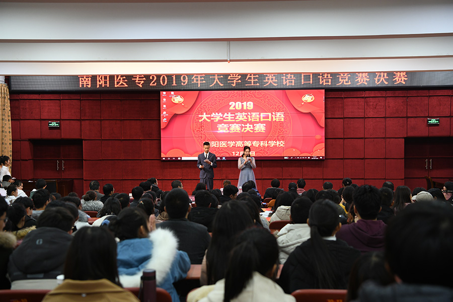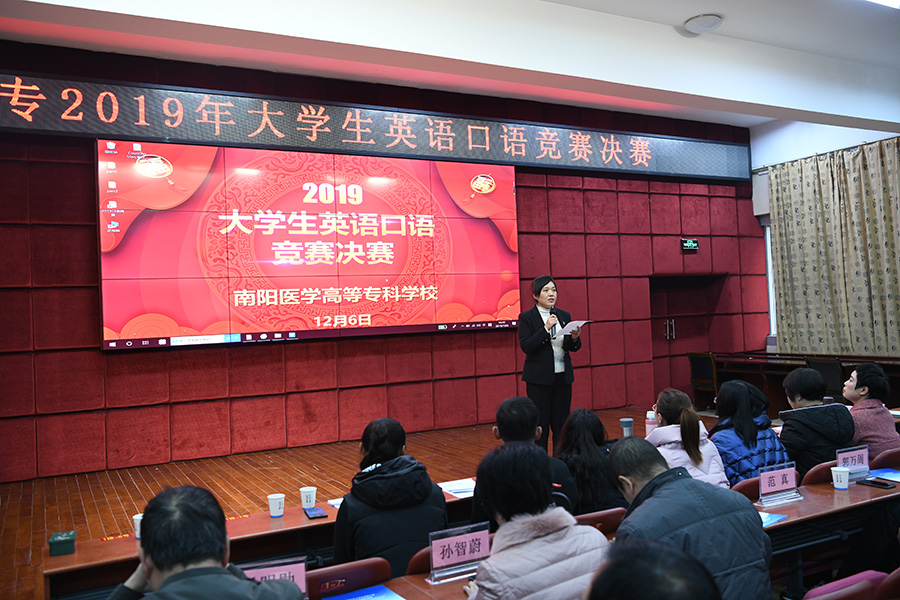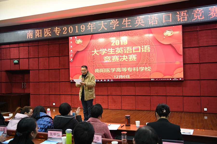 本网讯(文/公共教学部 李朝)12月6日下午,南阳医专2019年大学生英语口语竞赛决赛在仲景西区图书馆五楼报告厅举行。学校党委委员、副校长郭万周、范真莅临比赛现场指导;各系(院)领导和师生代表200余人观看了比赛。