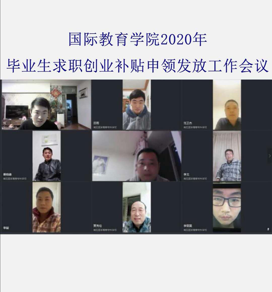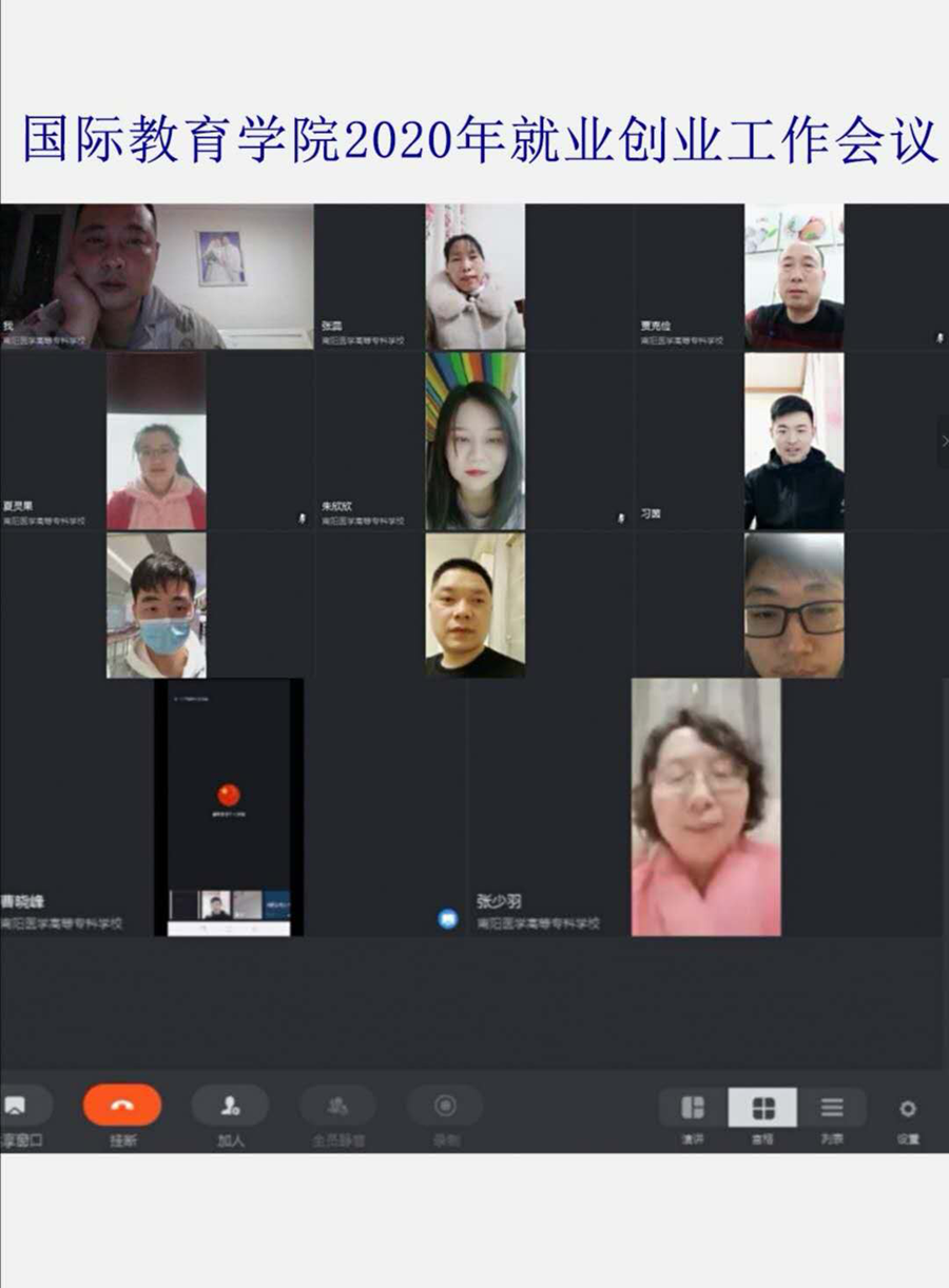 本网讯(文/国际教育学院 夏灵果)2020年,一场新冠肺炎疫情打乱了春天应有的节奏,然而国际教育学院学生工作却在紧张有序推进,学院领导、辅导员及班主任先后通过视频连线、电话慰问等方式细致落实2017级学生的疫情防控宣传教育及分类排查、实习手续办理、就业引导与服务等工作,及时表彰在疫情防控期间坚守一线的实习生。3月19日晚学院再次召开毕业生工作会议,党总支书记张少羽、副院长范卫杰、学工办主任习茵及全体辅导员和2017级班主任参会。
