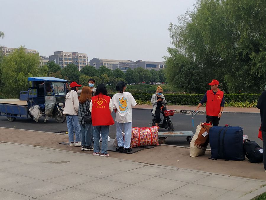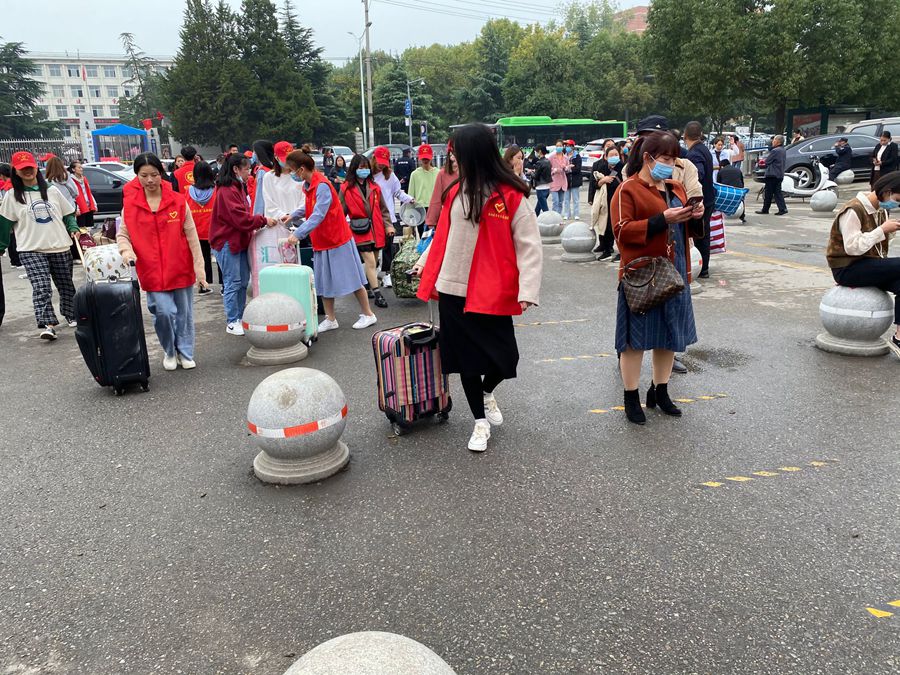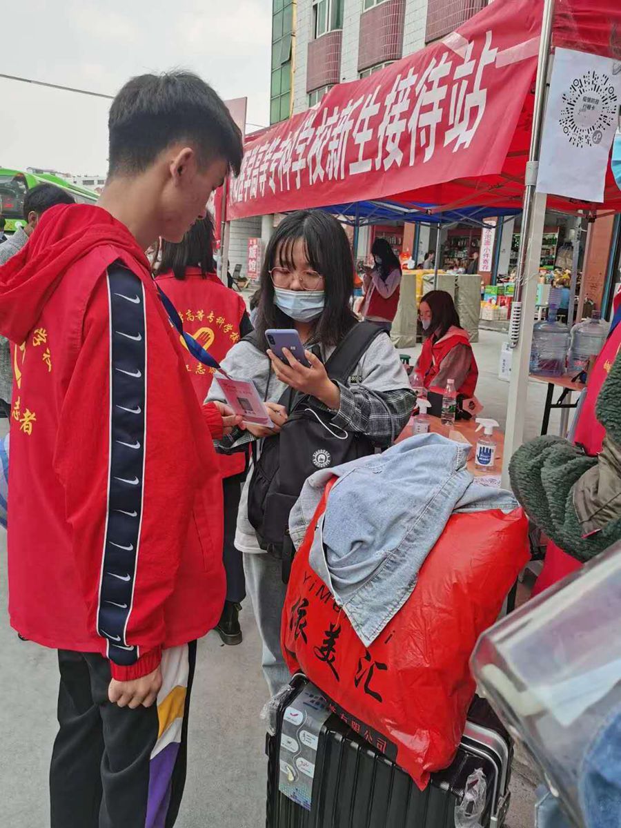 在火车站、汽车站和高铁站的迎新接待站,志愿者们指导新生和家长扫完疫情防控行程码后,带领他们乘坐学校安排好的车辆前往学校。在各个校区,志愿者们为新生的行李消毒后,带领他们刷身份证、查询班级信息、提交学籍档案、领取宿舍号,最后入住宿舍。全体志愿者们带领新生有条不紊地完成报到所有程序。