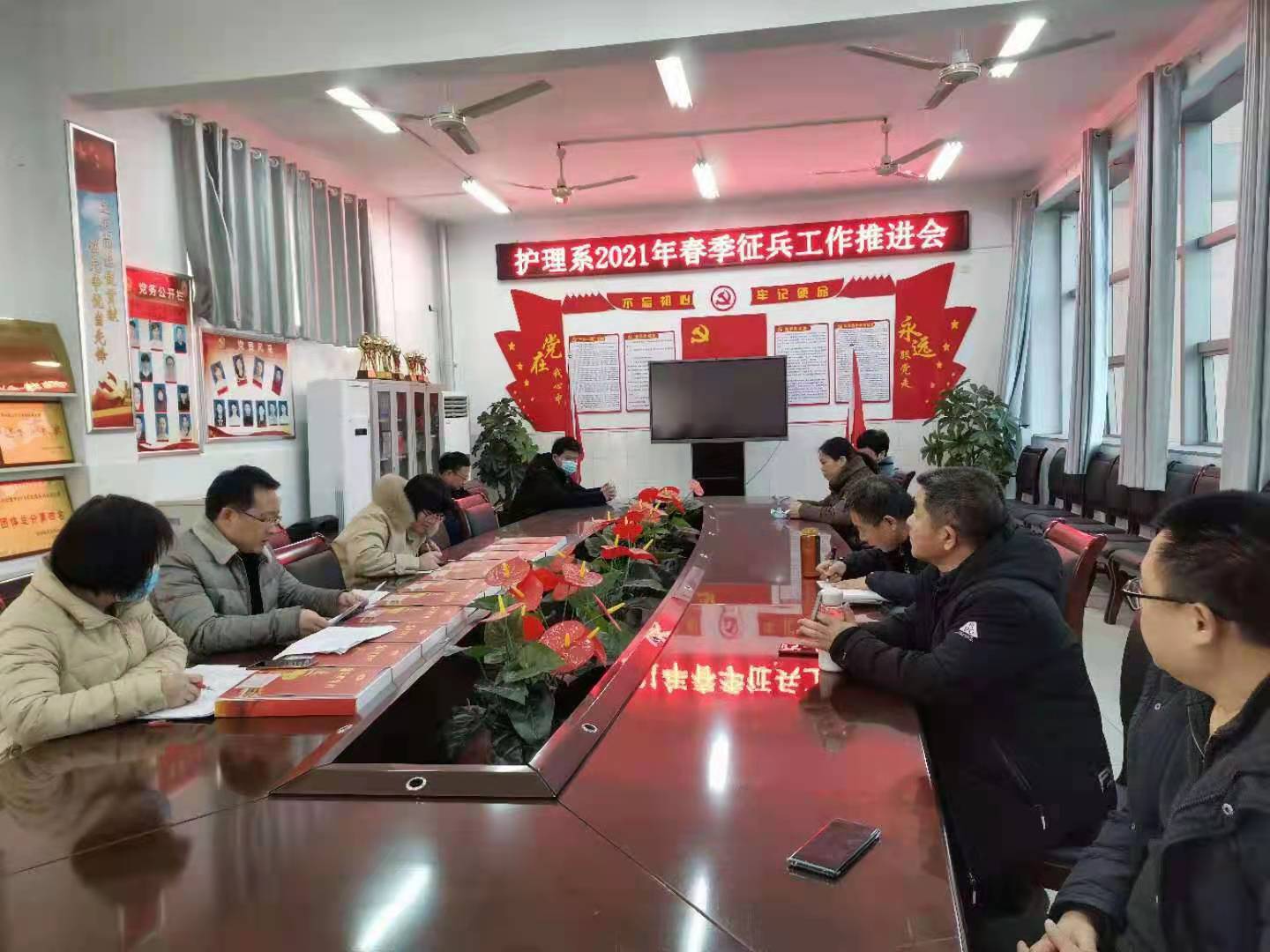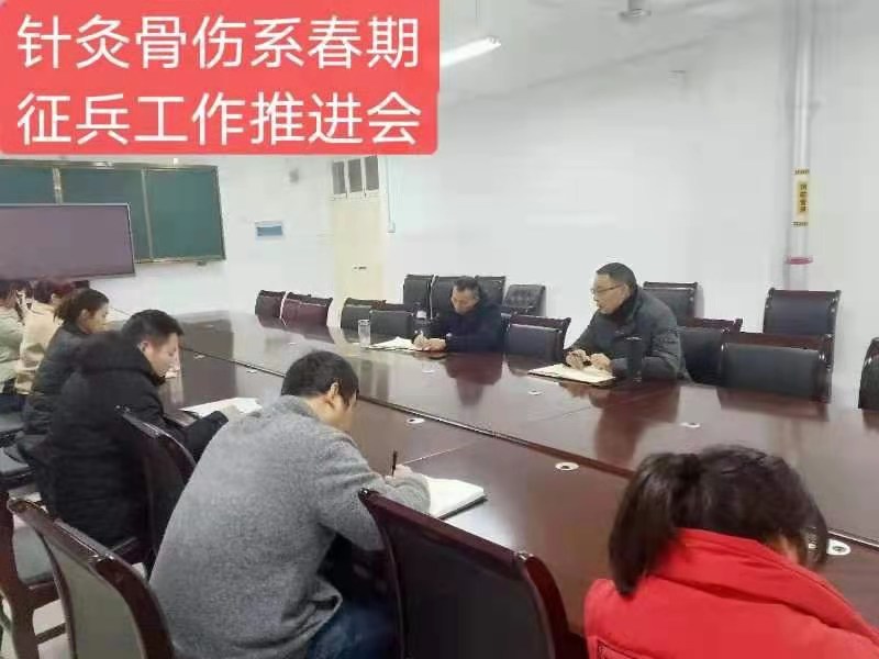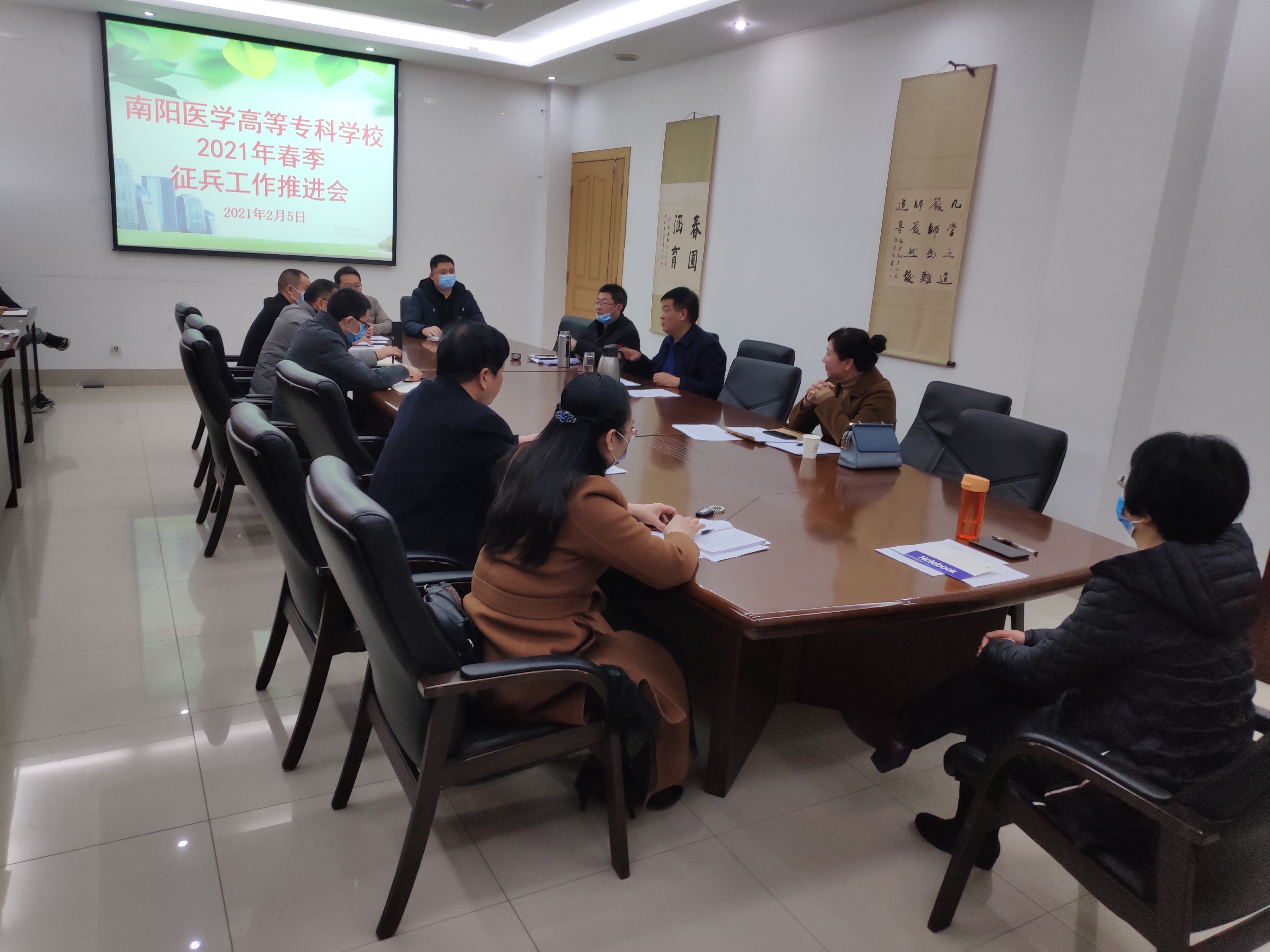 本网讯(文/学生处 皇甫乐观)为进一步落实2021年“两征两退”工作任务,推进征兵工作提质增效。2月5日下午,南阳医专在仲景西区行政楼2号会议室再次召开2021年春季征兵工作推进会。学校党委委员、副校长郭万周出席,武装部部长梁顺平、副部长余飞海及各系院书记、副书记、学工办主任和征兵专干参加会议。会议由学校武装部部长梁顺平主持。