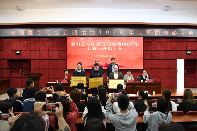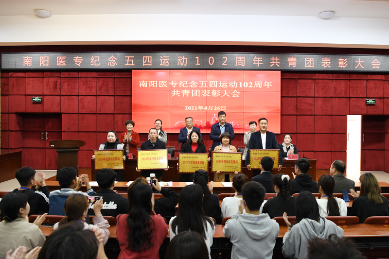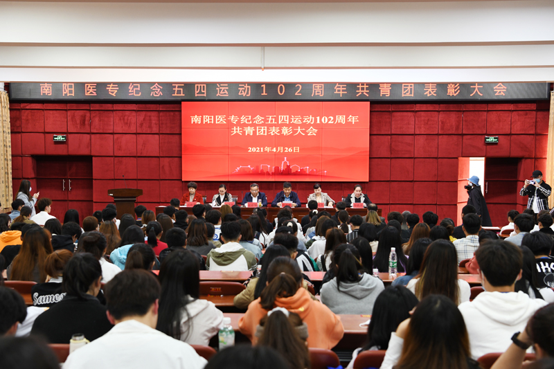 本网讯(文/校团委 庞博)2021年4月26日下午,南阳医专纪念五四运动102周年共青团表彰大会在图书馆五楼学术报告厅召开。校党委副书记逵应坤,校党委委员、副校长郭万周,党委组织部部长杜晓平,党委学工部部长、学生处处长梁顺平,政治理论教学部主任冯晓青,各个系(部、院)团总支书记和全校团员代表参议会议,会议由校团委书记徐晓杰主持。