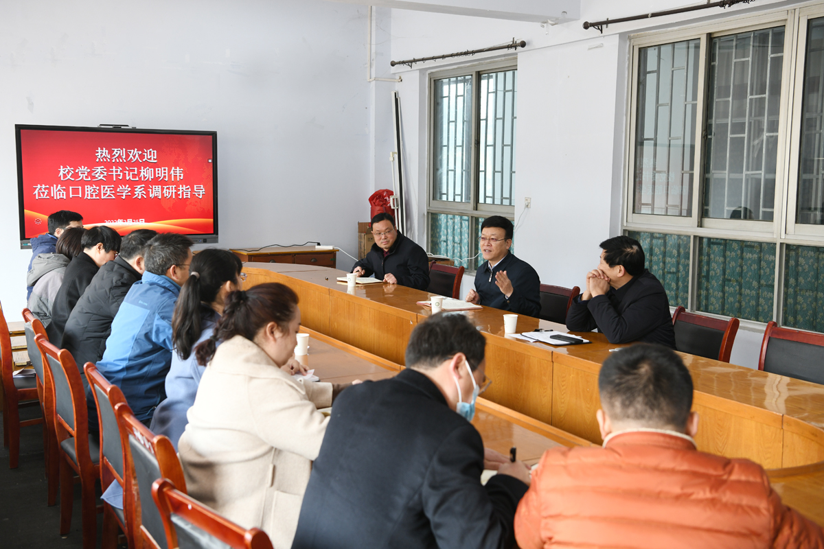 在认真听取汇报后,柳书记对口腔医学系周密谋划平安开学工作和着眼实际规划学科建设给予充分肯定,就进一步做好工作提出了三点希望和要求:一是要抓好学科建设上水平这一核心,理清思路、明确目标、找准定位、形成特色。二是要抓住人才培养这一根本,落实立德树人根本要求,创新思政育人模式。三是抓住教师队伍培养这一关键,广引英才,提升能力。
