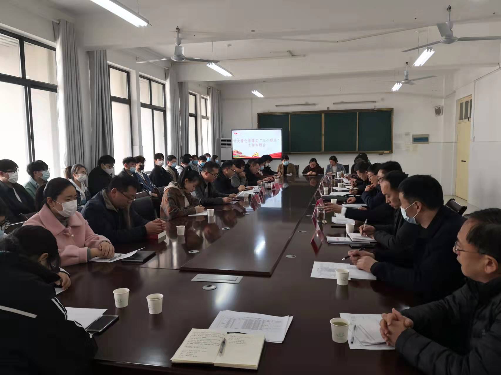 张国良作了总结讲话。他指出,开展“七进三联系”系列活动是落实习近平总书记立德树人根本任务,是实现党史学习教育常态化制度化的重要举措,是提升相关职能部门育人能力与育人水平、培养高质量人才的有力抓手。全体人员在今后的工作实践中要主动保持与分包班级联络常态化,深入学生开展谈心谈话,了解学生思想动态;主动关心学生学习生活,为学生健康成长保驾护航;主动俯下身来,深入了解学生生活中遇到的难题,切实为学生办实事、办好事;要主动定期为学生上好思政课,紧扣时代主题,厚植爱国情怀,点亮学生成长的明灯。