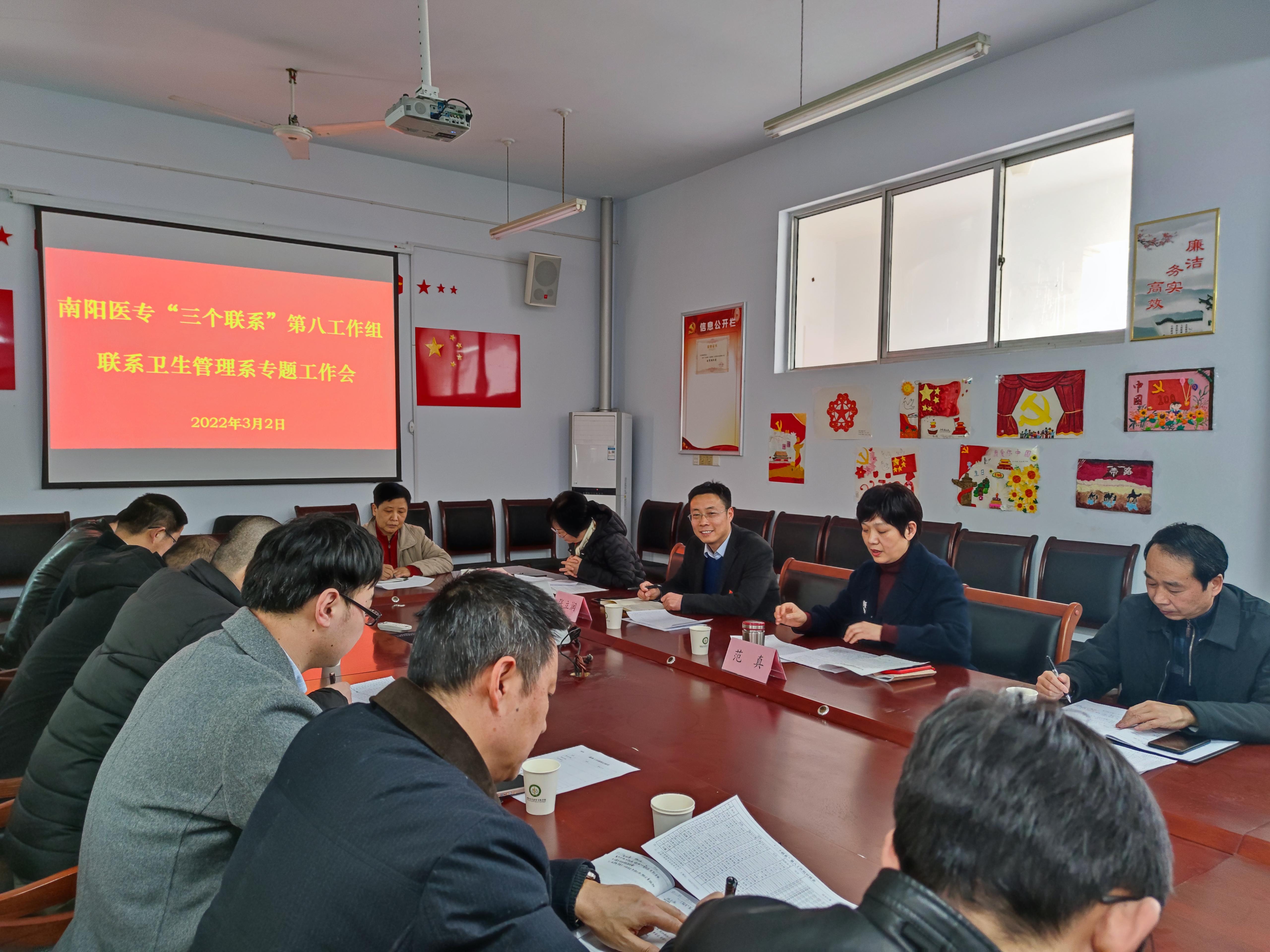 本网讯(文/教务处  梁亮)为贯彻落实《关于推进党史学习教育常态化 建立为师生办实事制度的实施意见》(宛医专党〔2021〕71号)文件精神,把“三个联系”工作制度落地落实,南阳医专“三个联系”第八工作组和卫生管理系于3月2日下午在1号教学楼卫管系办公室召开了专题工作会。第八工作组组长、南阳医专校党委委员、副校长范真,工作组副组长、教务处处长刘荣志带队参加了专题工作会。卫生管理系副科以上干部和全体班主任参会。