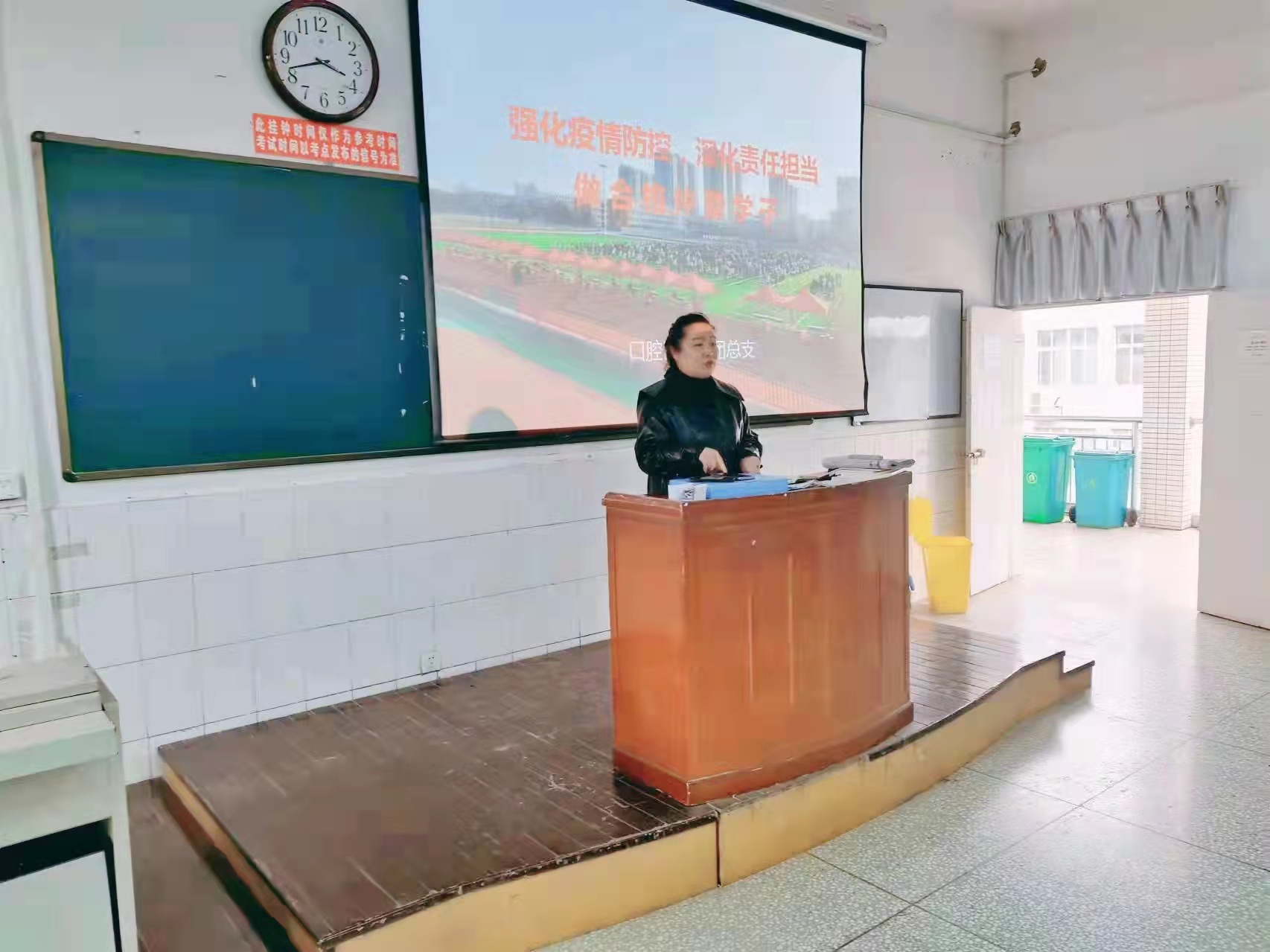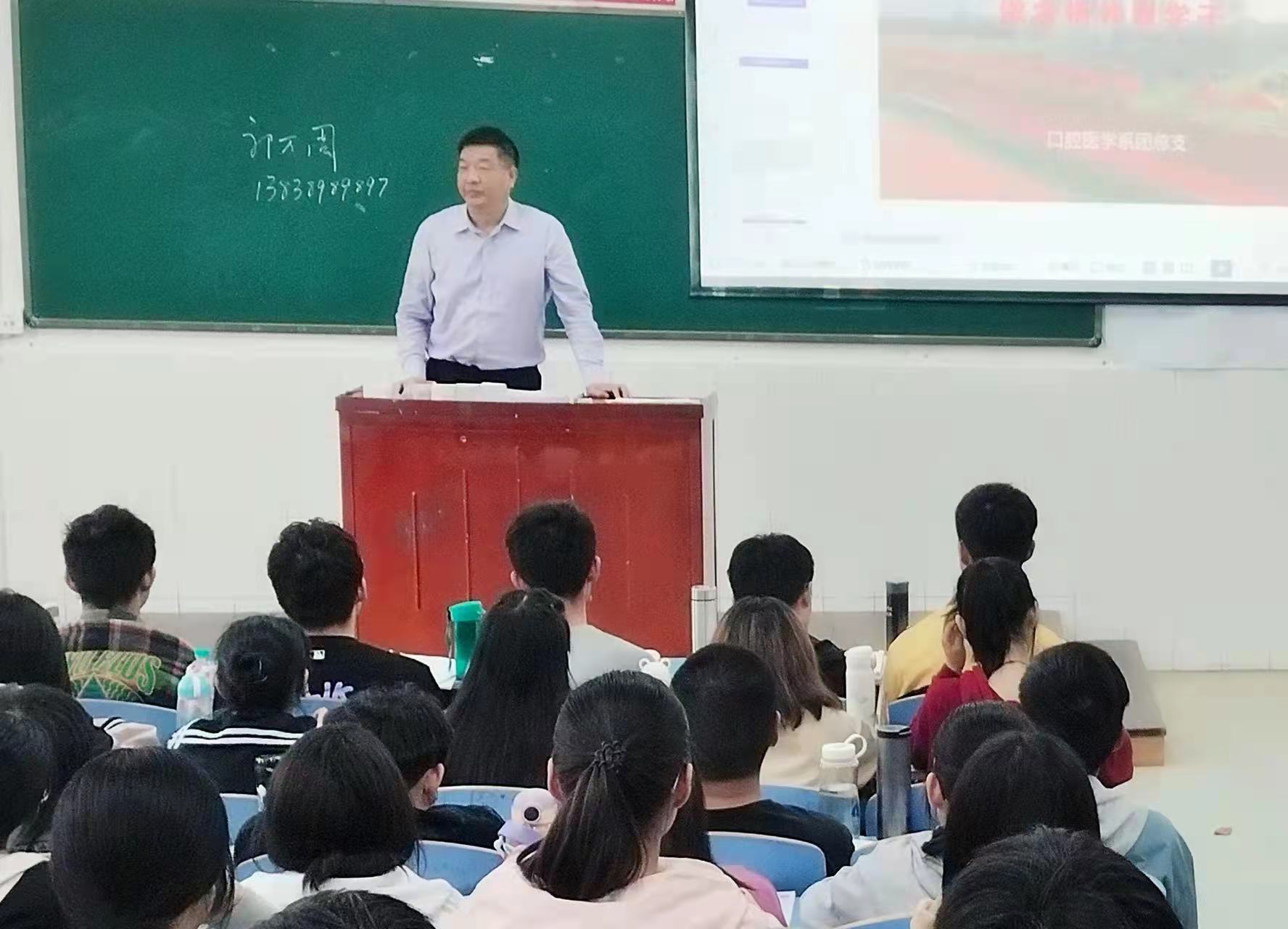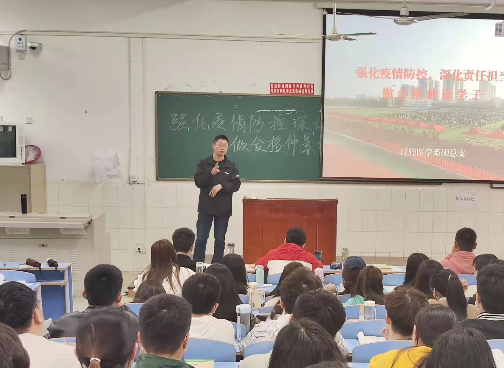 本网讯(文/口腔医学系  王金金)当前疫情势态严峻,为确保师生身体健康和生命安全,织密扎牢学校疫情防控“安全网”,3月16日下午,口腔医学系召开“强化疫情防控,深化责任担当,做合格仲景学子”的主题班会。“三个联系”第六工作组组长、副校长郭万周、口腔医学系党总支书记余飞海与全体师生同上“疫情防控课”。
