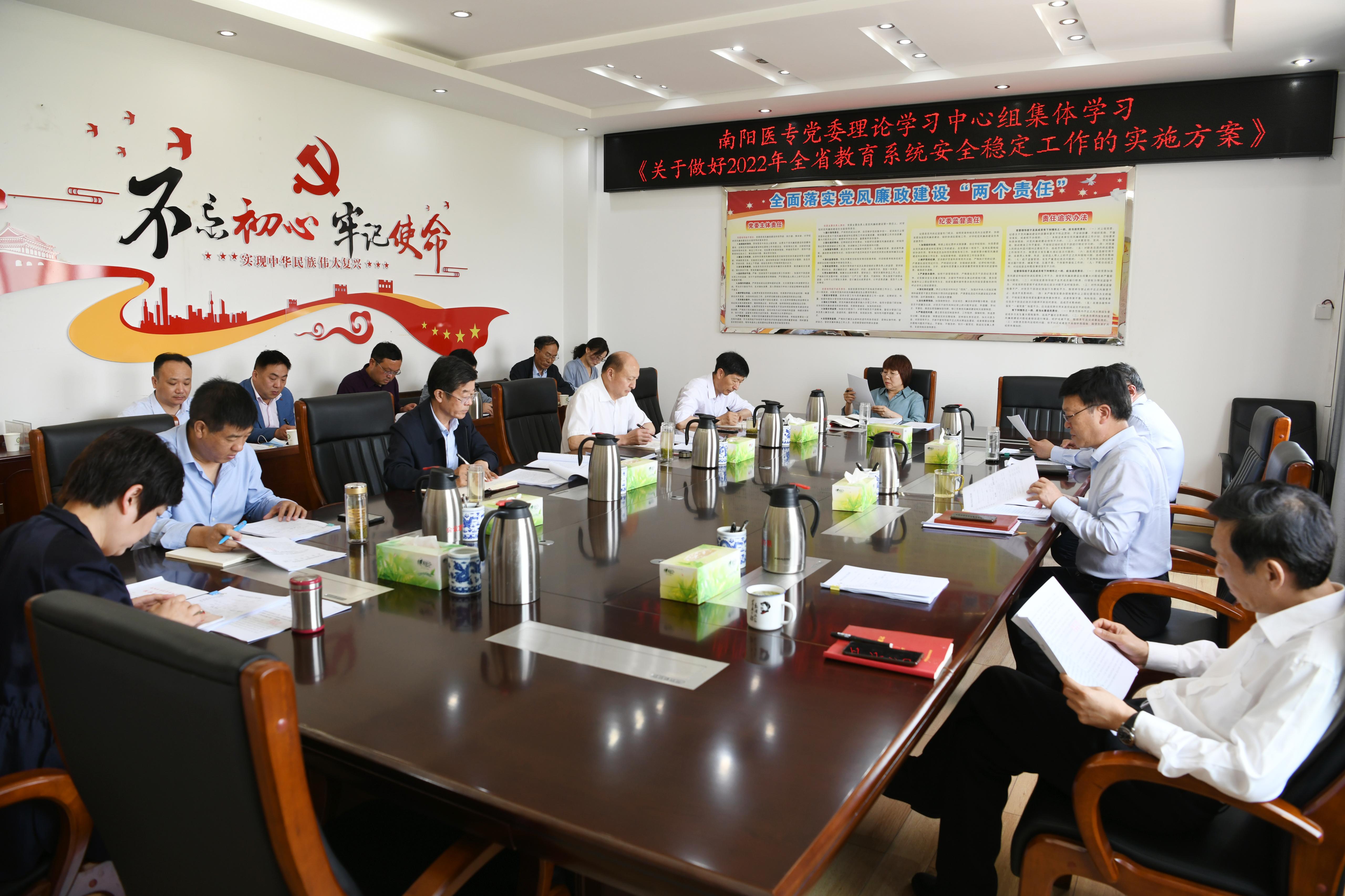 本网讯(文/宣传部 潘晓红)4月26日上午,学校召开党委理论学习中心组集体学习会,传达学习省高工委、省教育厅《关于做好2022年全省教育系统安全稳定工作的实施方案》(豫教工委〔2022〕22号,以下简称《方案》)的精神,安排部署贯彻落实工作。党委书记柳明伟讲话,党委副书记逵应坤主持,党委理论学习中心组成员、相关部门负责人参加会议。