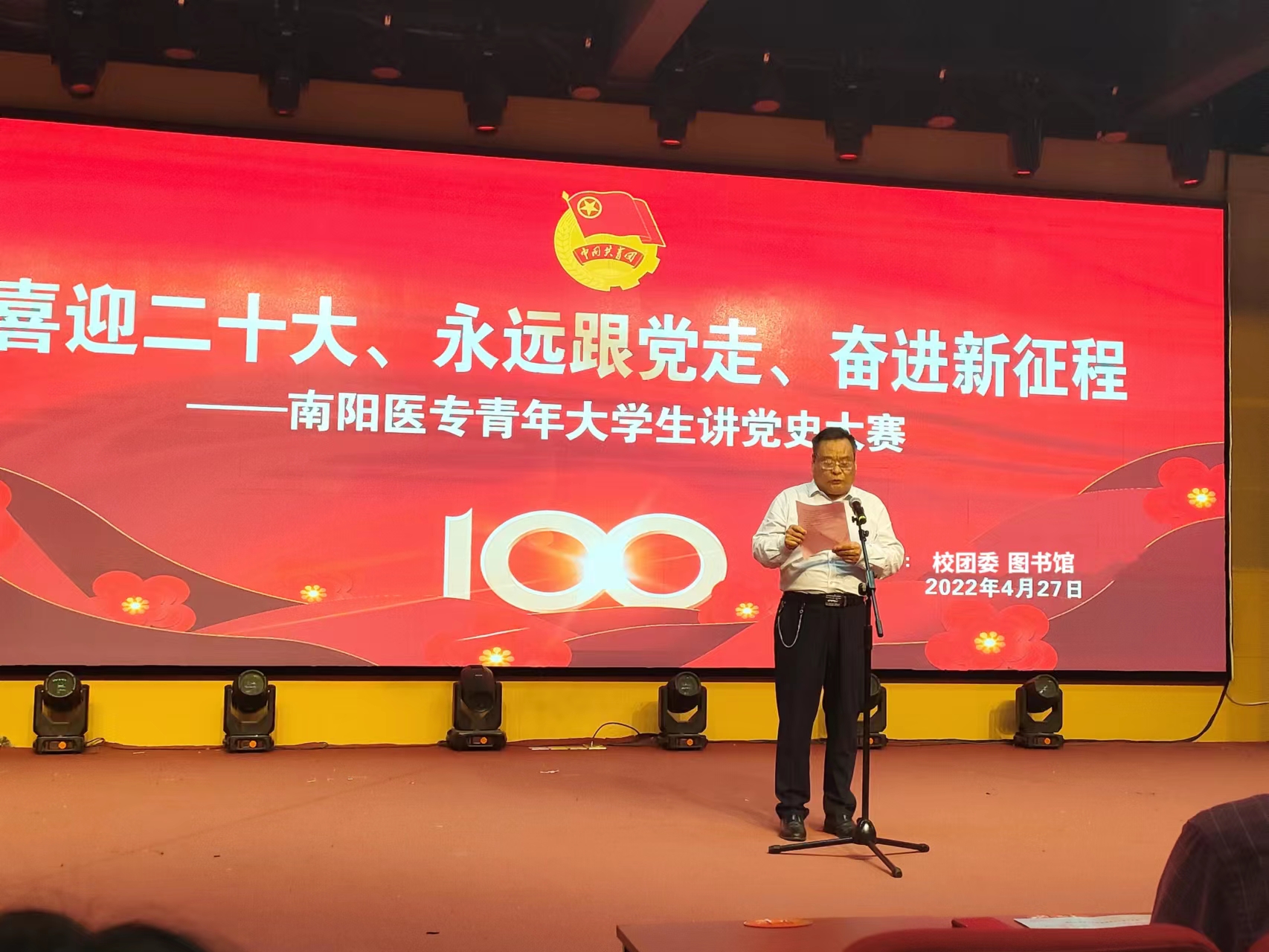 本网讯(文/校团委 古婵婵)4月27日,由校团委、图书馆主办的“喜迎二十大、永远跟党走、奋进新征程”南阳医专青年大学生讲党史大赛在多盈手机在线登录仲景东区礼堂隆重举行。校党委副书记逵应坤、校团委书记徐晓杰出席本次比赛,宣传部副部长陈铁良、学生处副处长闫珂、公教部副主任夏曼、图书馆副馆长孟玫、公教部艺术教研室主任张艳担任本次比赛的评委。