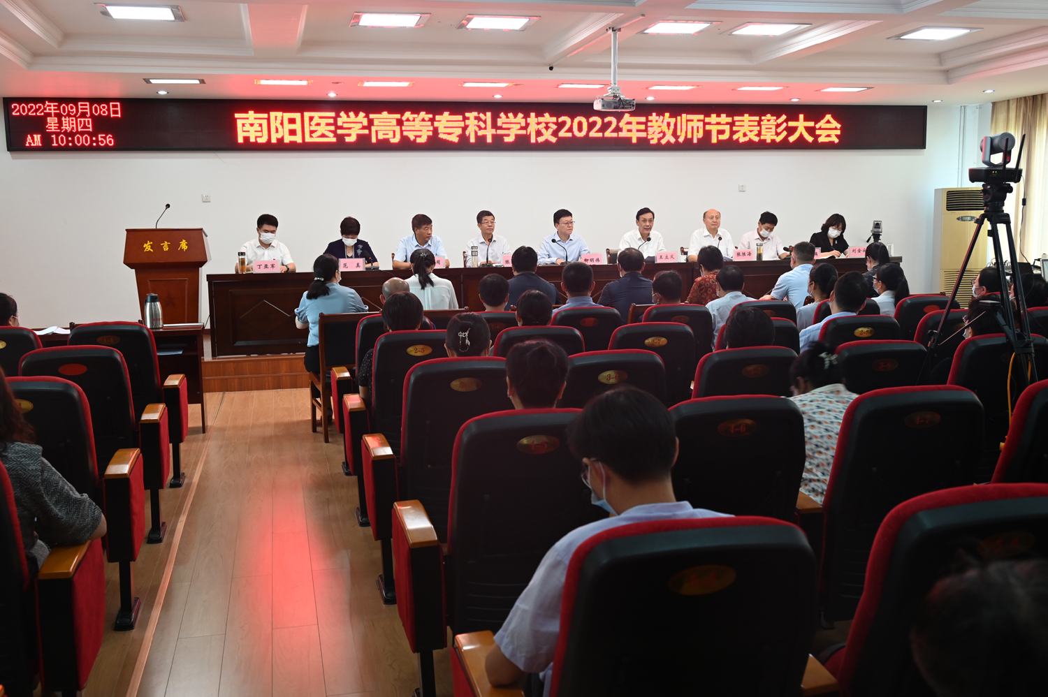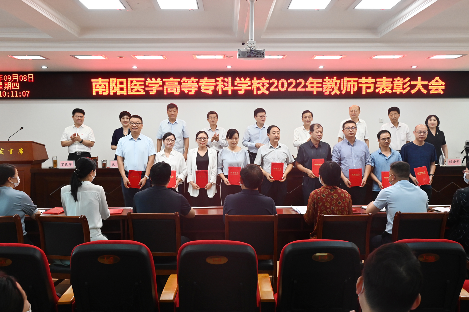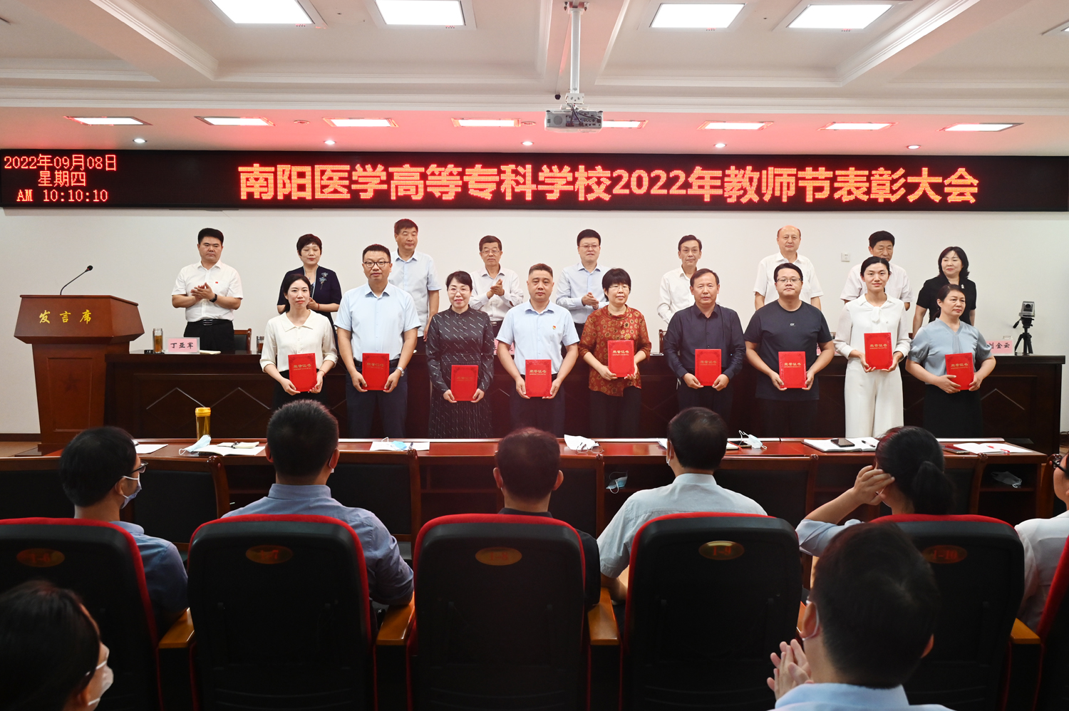 会上,副校长张国良宣读了《2021-2022学年省级及以上教育教学荣誉表彰名单》;副校长张胜海宣读了《南阳医专关于2021-2022学年优秀专业带头人的表彰决定》;副校长范真宣读了《南阳医专关于表彰2021-2022学年优秀教师、优秀教育工作者的决定》,校领导对获奖代表进行了现场颁奖。教师郭晓萱、钮靖作为代表分别进行发言,分享了自己对“教师”的理解和感悟,并表示将忠诚党和人民的教育事业,不忘教育初心、牢记教师使命,以实际行动做到爱校爱教、敬业乐业。
