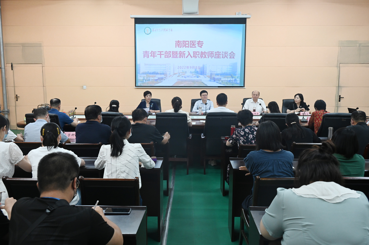 本网讯(文/党政办公室 刘辉)为加强青年干部、青年教师的培养,使其快速成长,发挥好学校发展的“生力军”作用。9月8日下午,学校在仲景西区体育训练馆1楼会议室召开青年干部暨新入职教师座谈会。党委书记柳明伟、副校长范真、纪委书记刘金云出席会议,相关部门及系(部、院)负责同志、校本部青年干部代表、2022年全体新入职教师参加会议。会议由副校长张胜海主持。