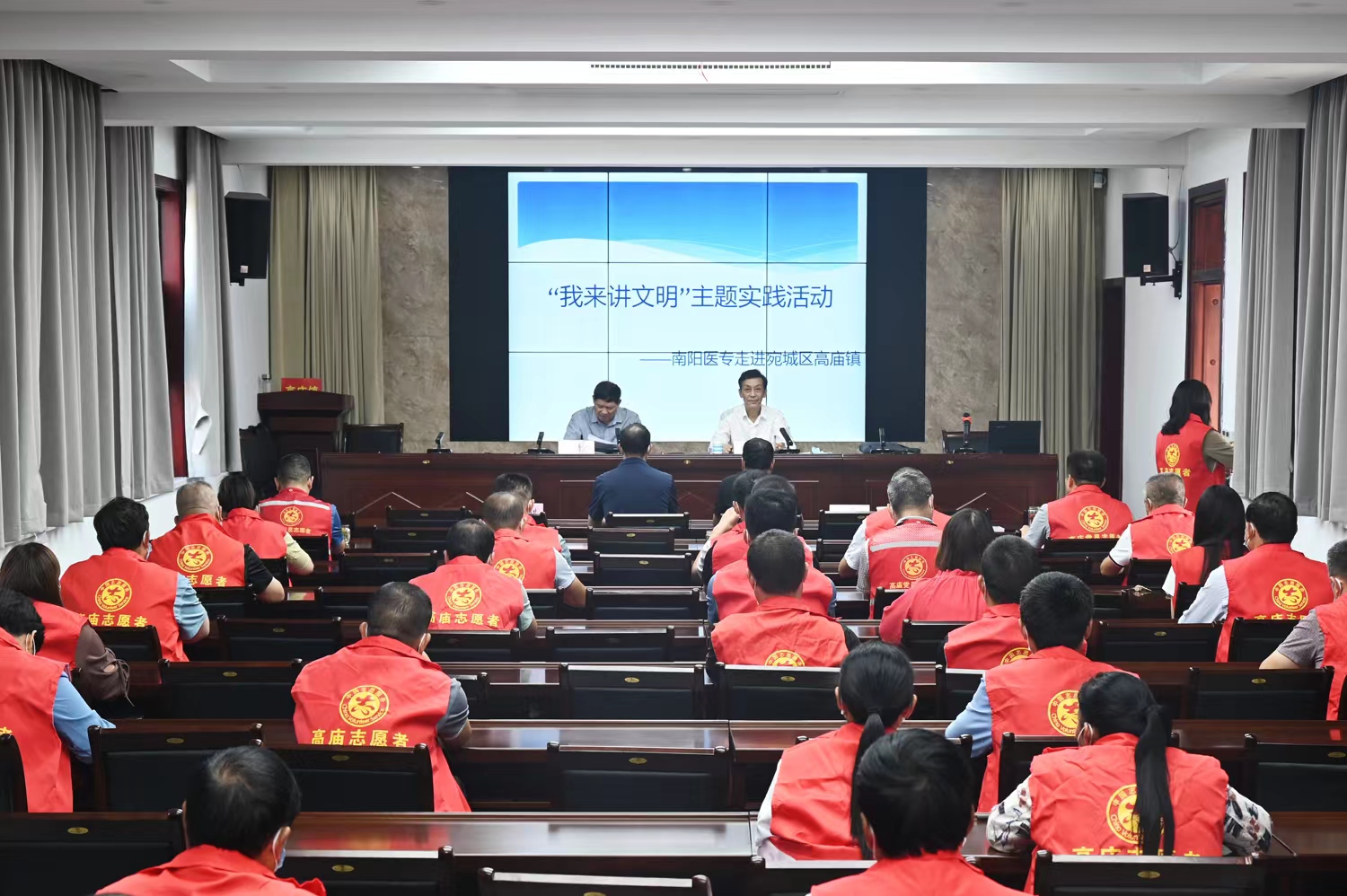 本网讯(文/宣传部 张旭斌)9月14日上午,校长王立义赴宛城区高庙镇开展“我来讲文明”主题实践活动。高庙镇党政班子成员、相关部门人员与部分村委成员、文明商户代表50多人参加主题讲座。讲座由宛城区政府党组成员姚河予主持。