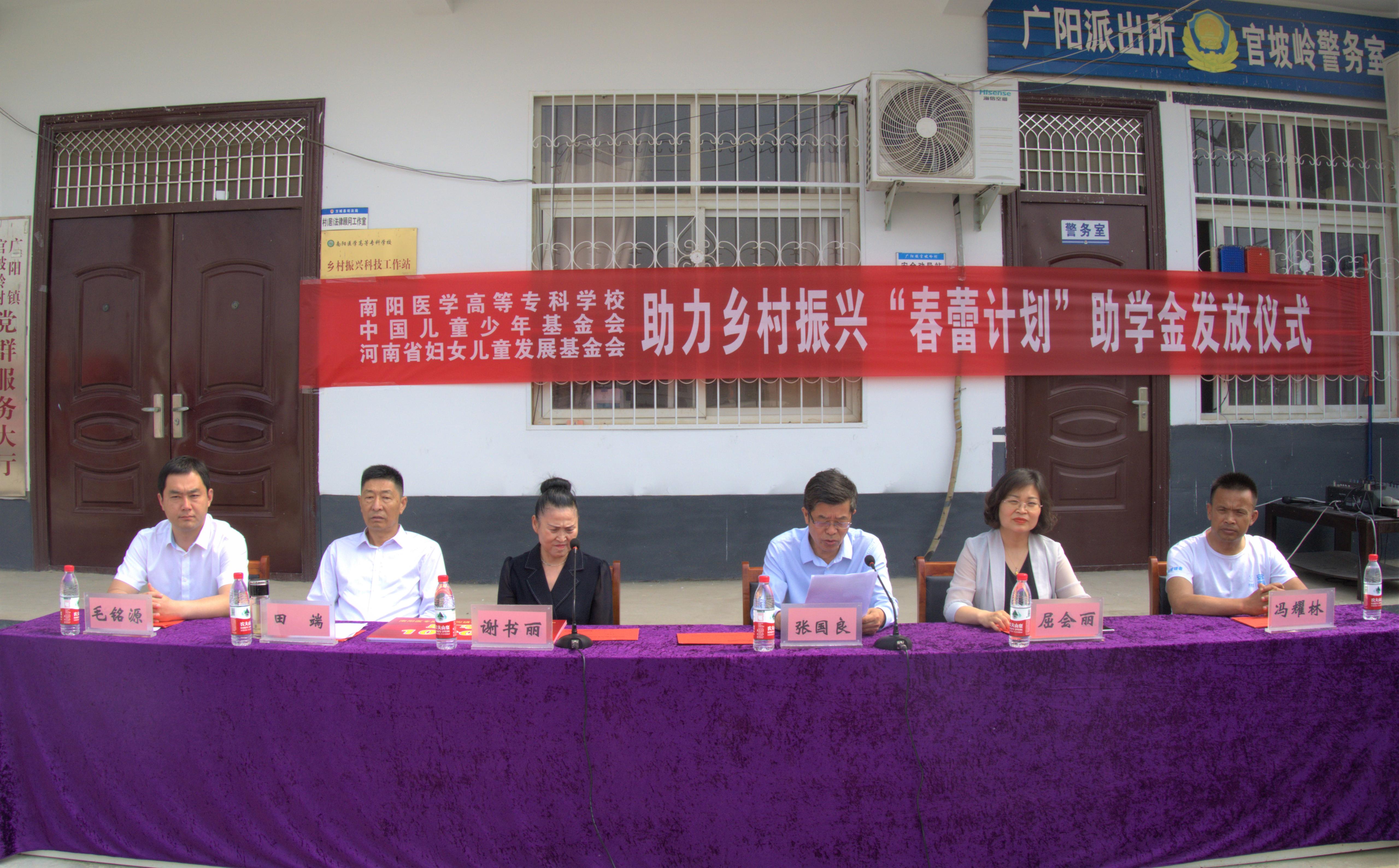 5月18日上午,为了及时传递、充分表达南阳医专党委对助力乡村振兴工作的高度重视和对帮扶村在校女学生学习生活的关怀激励,8位学校帮扶干部在校党委委员、副校长张国良,党委委员、工会主席田端的带领下,来到了学校帮扶村方城县广阳镇官坡岭村,为该村和沙沟镇村共20位在校困境家庭女学生送去了“春蕾计划”助学金共19200元。