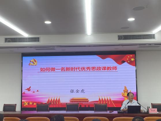 马克思主义学院特聘教授张金虎作了题为《如何做一名优秀思政课教师》的讲座,阐述了思政课的特殊地位和重大作用,并从提高自身的政治素质和业务水平、上好每一堂思政课两个方面为全体思政课教师指明了提升与发展的方向、方法。