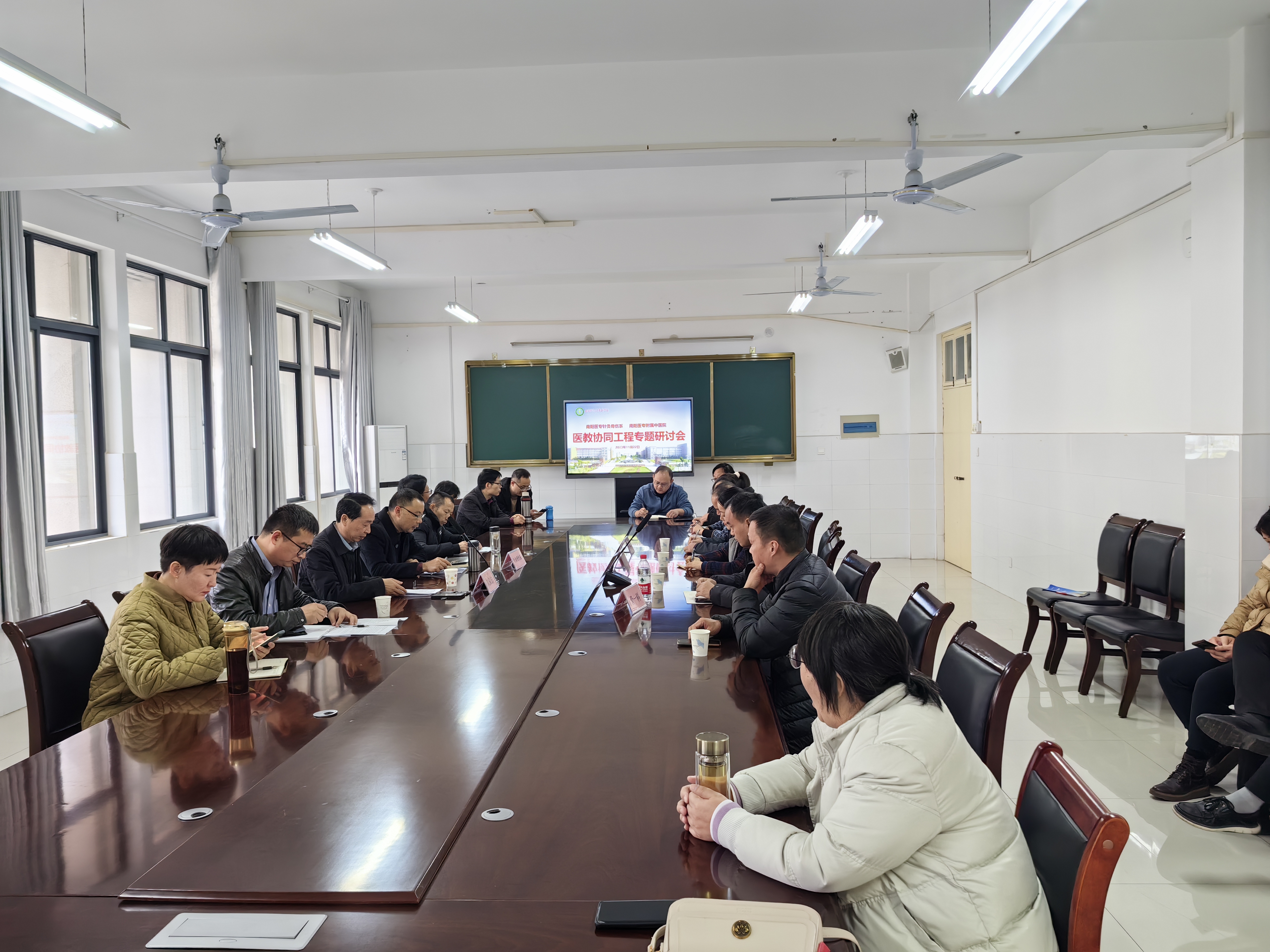 本网讯(文/针灸骨伤系 逵建澍)11月22日下午,针灸骨伤系在仲景东区士安楼4楼会议室举行医教协同工程专题研讨会。校党委委员、副校长刘荣志出席会议,针灸骨伤系全体教职工,附属中医院骨伤科、针灸康复科等相关科室负责人参加研讨会。会议由针灸骨伤系党总支书记毕跃忠主持。