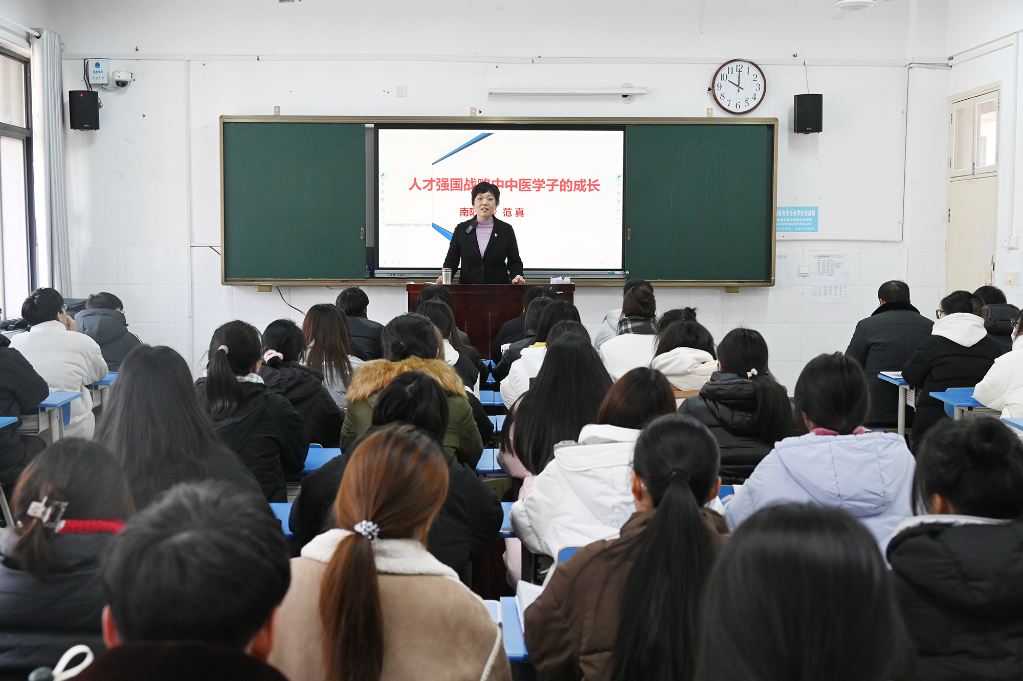范真以《人才强国战略与中医学子的成长》为题,从“着眼长远发展的重大抉择”“铸就强国建设的坚实基础”“加快强国建设的战略部署”“充分发挥高校的重要作用”四个方面阐释了党的二十大报告提出的“实施科教兴国战略、人才强国战略、创新驱动发展战略”的重要意义,并根据现代职业教育体系建设改革重点任务,对学生进行了深入的讲解。她以自己的亲身经历和深入思考讲述了多盈手机在线登录的发展历程,介绍了校党委在“职教三融”中如何实现以“职普融通”为关键点,以“产教融合”为突破口,以“科教融汇”服务创新驱动发展战略引领学校发展的整体思路。范真希望仲景学子要紧紧把握我国建设现代化职业教育发展趋势,努力学习专业知识,锤炼专业技能,打造复合型人才,将来为服务基层医疗卫生事业夯实基础,为服务大健康产业做好准备。