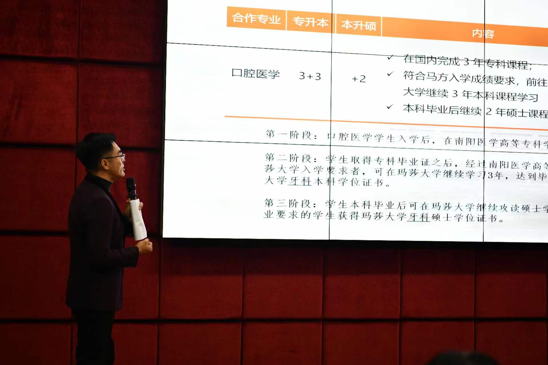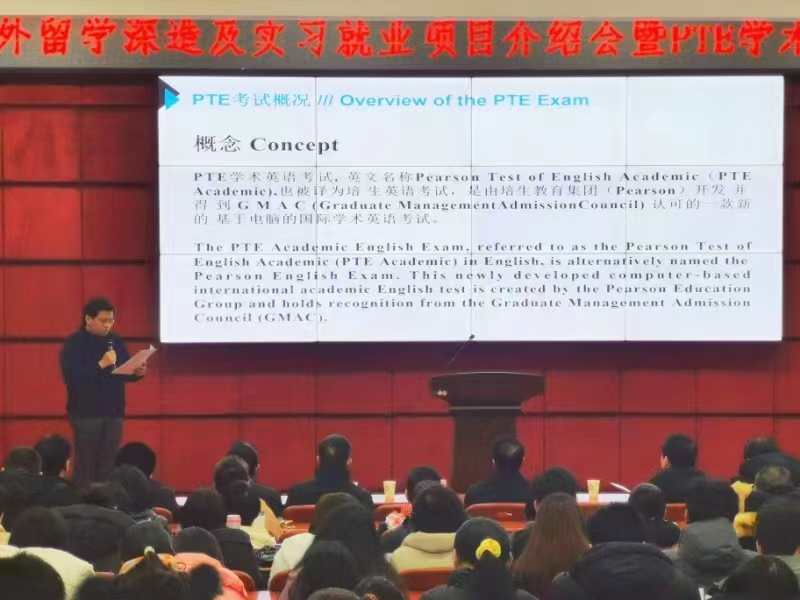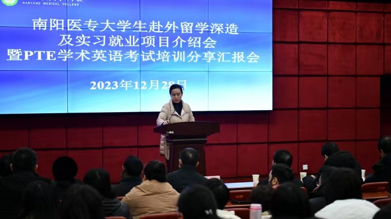 本网讯(文/国际教育学院 余雪)12月28日下午,南阳医专大学生赴外留学深造及实习就业项目介绍会暨PTE学术英语考试培训分享汇报会在仲景西区图书馆五楼报告厅成功举行。校党委委员、副校长刘荣志,外事处处长范卫杰,各涉学系(院)主任出席会议。会议由国际教育学院院长徐晓杰主持。