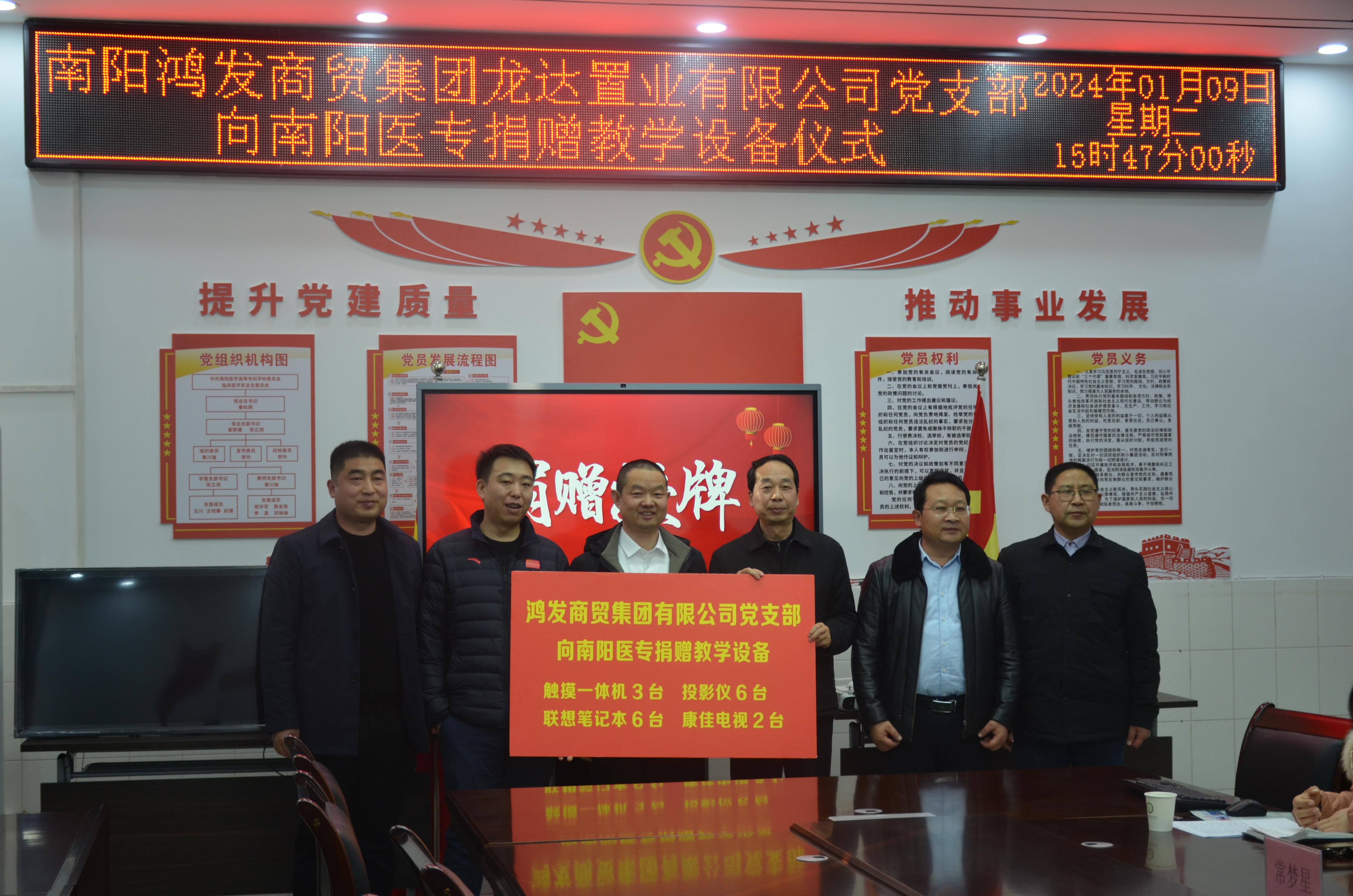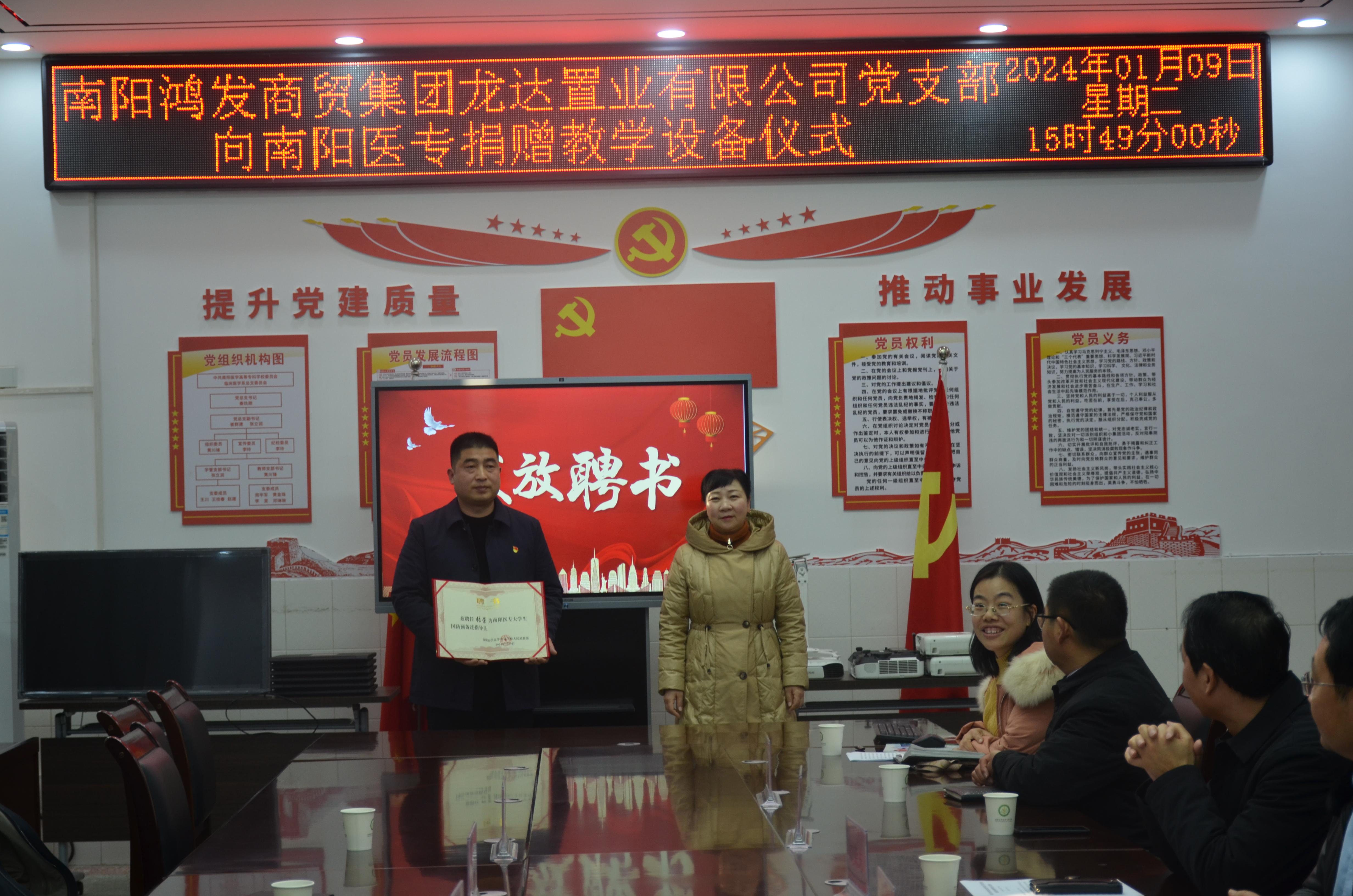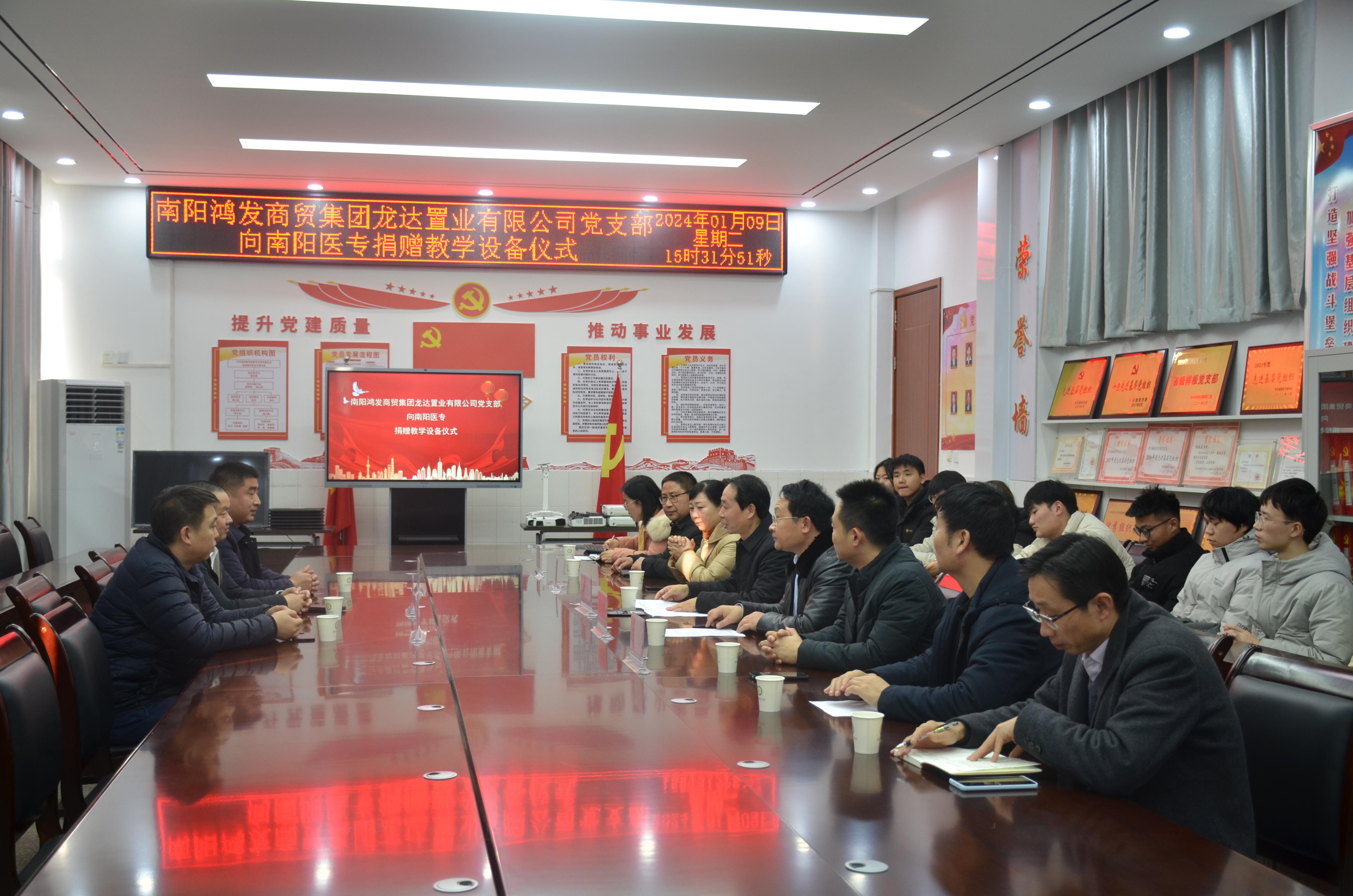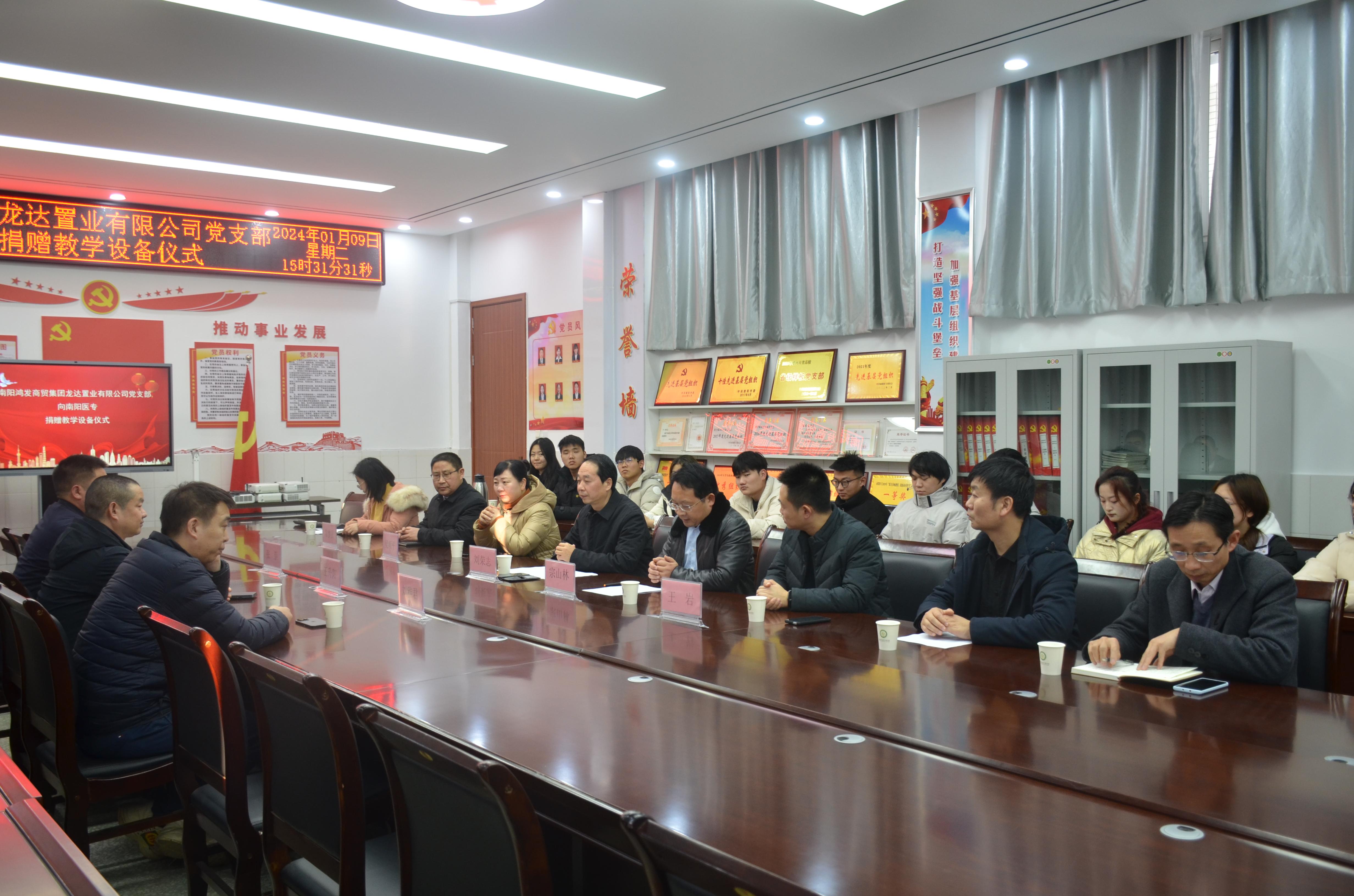 本网讯(文/临床系 王静)2024年1月9日下午,商贸集团龙达置业有限公司党支部向南阳医专捐赠教学设备仪式在4号教学楼408会议室举行。南阳医专党委委员、副校长刘荣志,鸿发商贸集团龙达置业有限公司总经理王升阳、党支部书记张崇,鸿发商贸集团龙达置业有限公司董事、中天碱业总经理刘雅君,党政办主任王岩,学生处处长、武装部部长梁顺平,设备处处长常梦星,临床医学系班子成员,以及南阳医专大学生国防预备连的学生代表出席,捐赠仪式由临床医学系党总支书记宗山林主持。