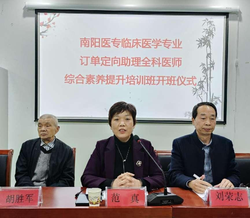 本网讯(文/临床医学系 李林)4月8日上午,南阳医专临床医学专业订单定向助理全科医师第一期综合素养提升培训班开班仪式在实验楼一楼临床医学模拟中心举行。校长范真、副校长刘荣志、“胡氏捻筋法”第三代传人胡胜军出席,中医系主任张明丽,医学技术系主任李玲,临床医学系党总支书记宗山林、副主任周毕军、授课教师代表以及第一期订单定向班全体学员参加开班仪式。开班仪式由副校长刘荣志主持。