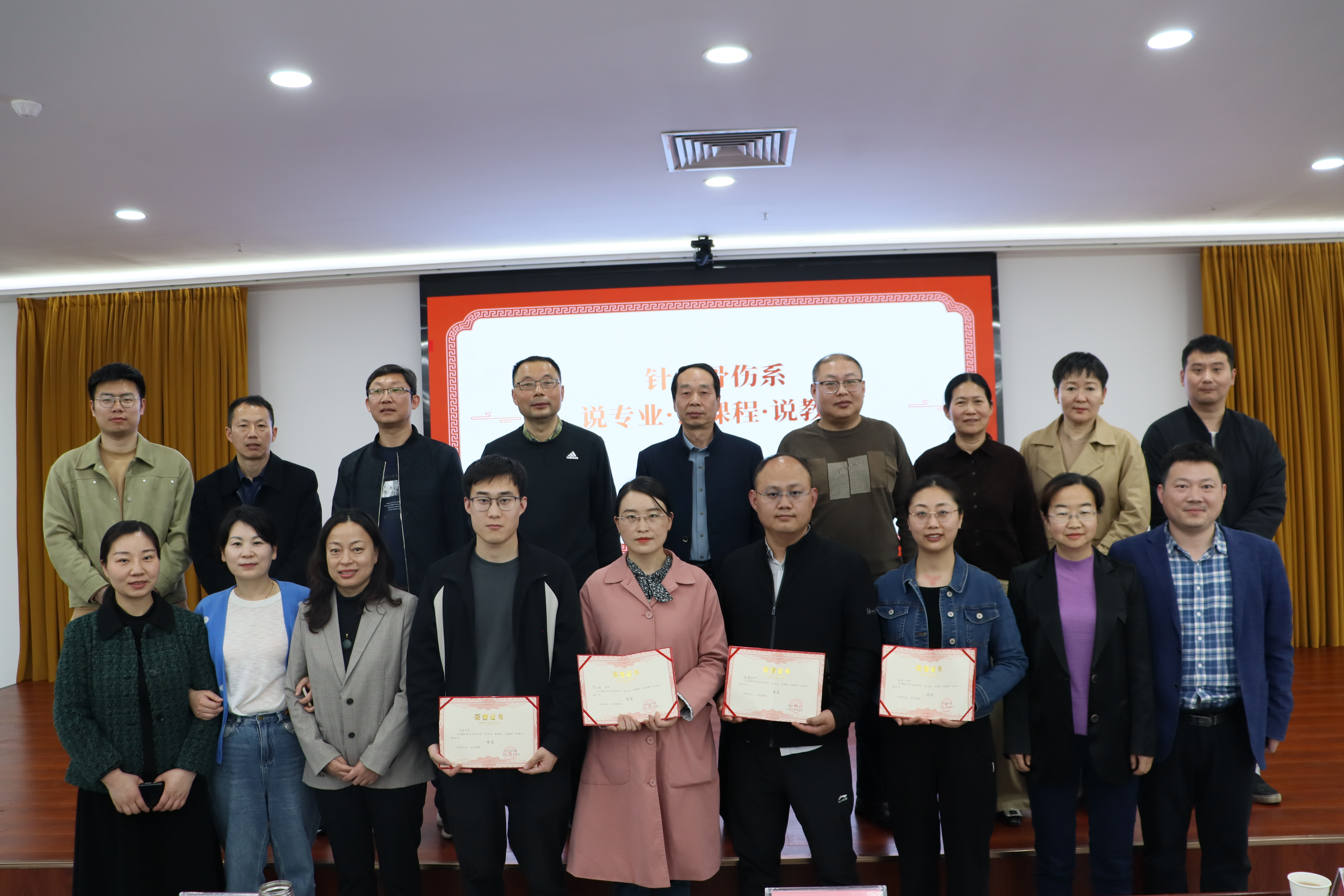 针灸推拿教研室主任刘春梅、中医骨伤教研室主任王冰、实训室主任钱航分别就针灸推拿专业、中医骨伤专业、实训平台建设情况进行了汇报。杨得光等7位专任教师分别结合专业课程进行了精彩展示。最终,杨得光老师获得了一等奖。