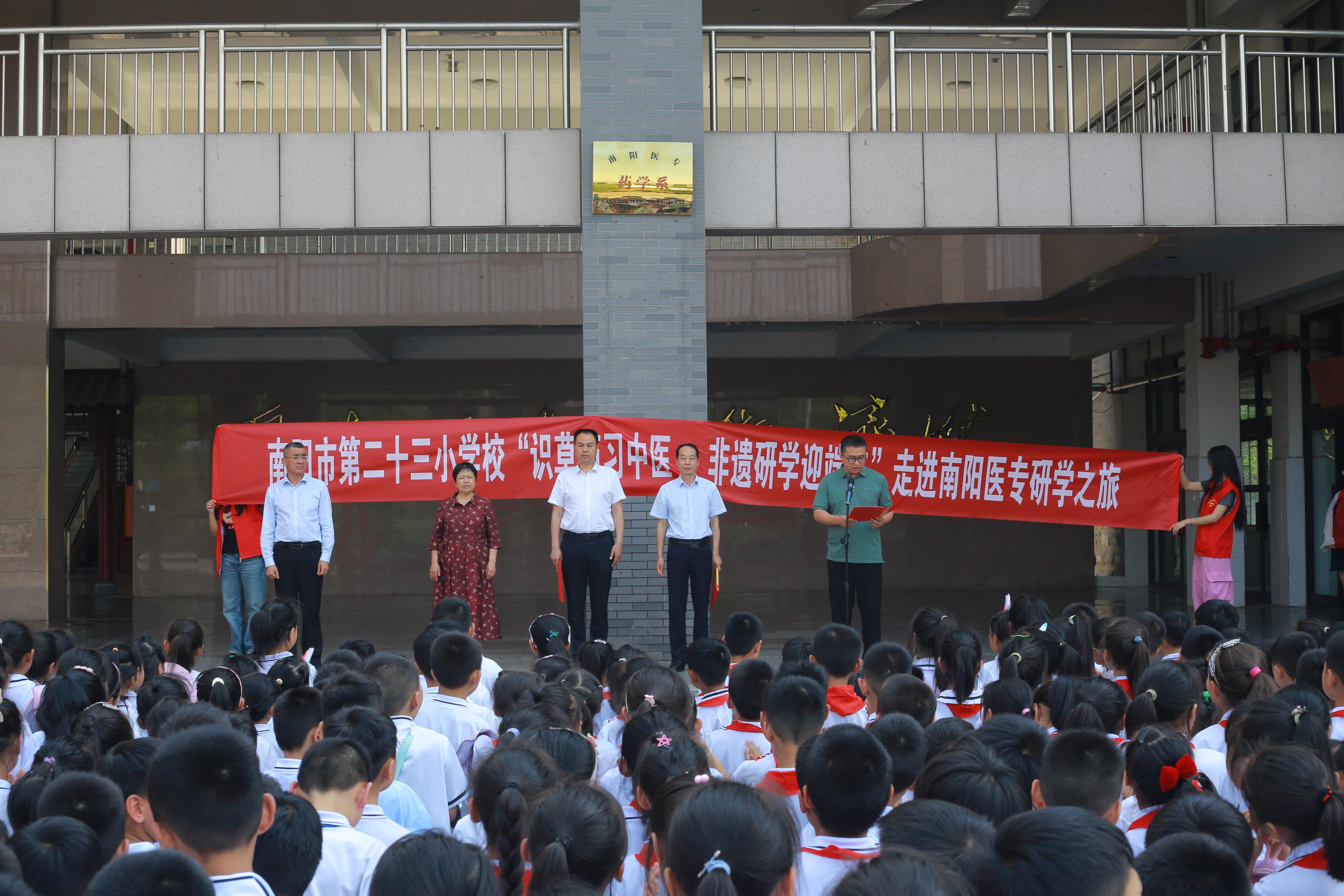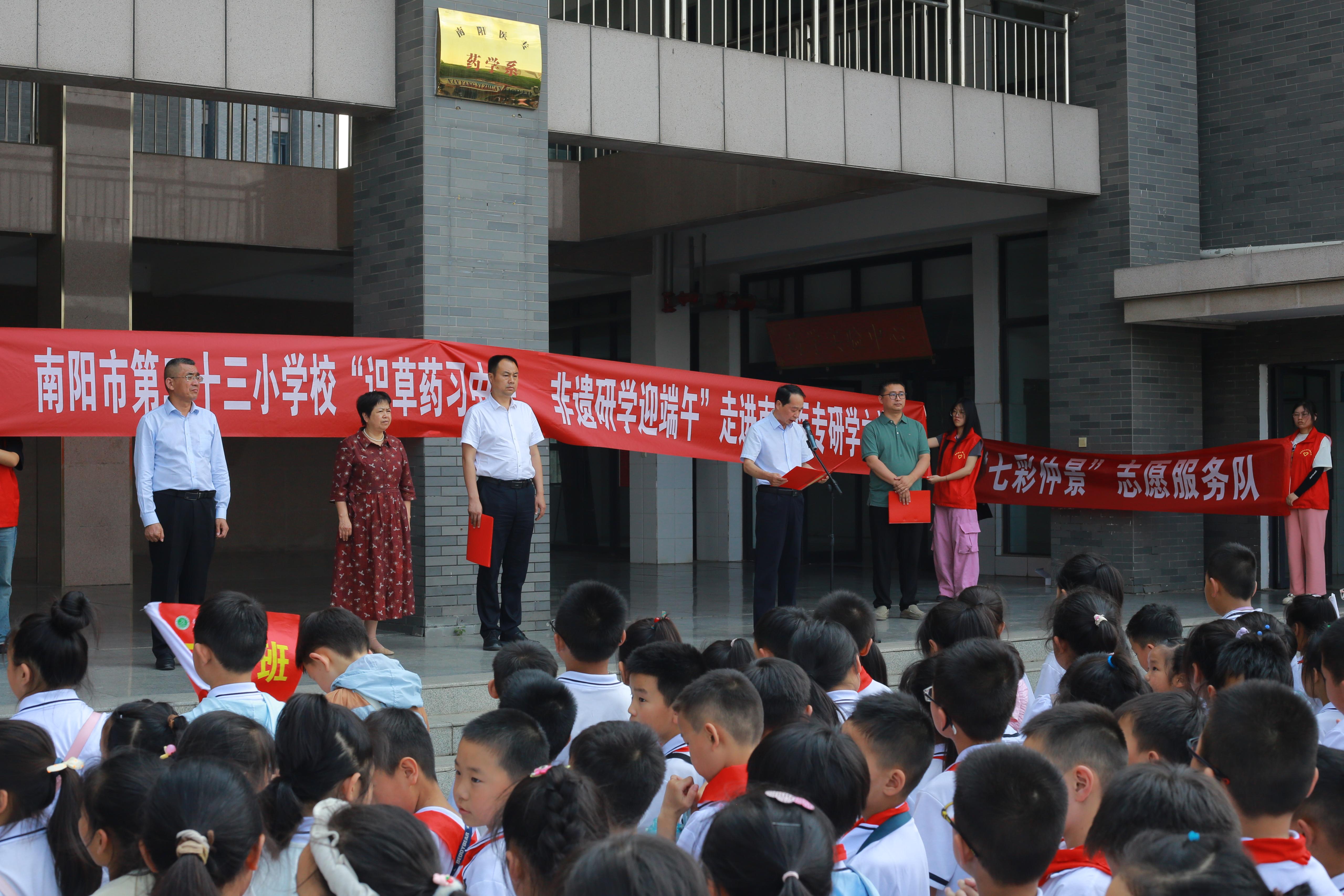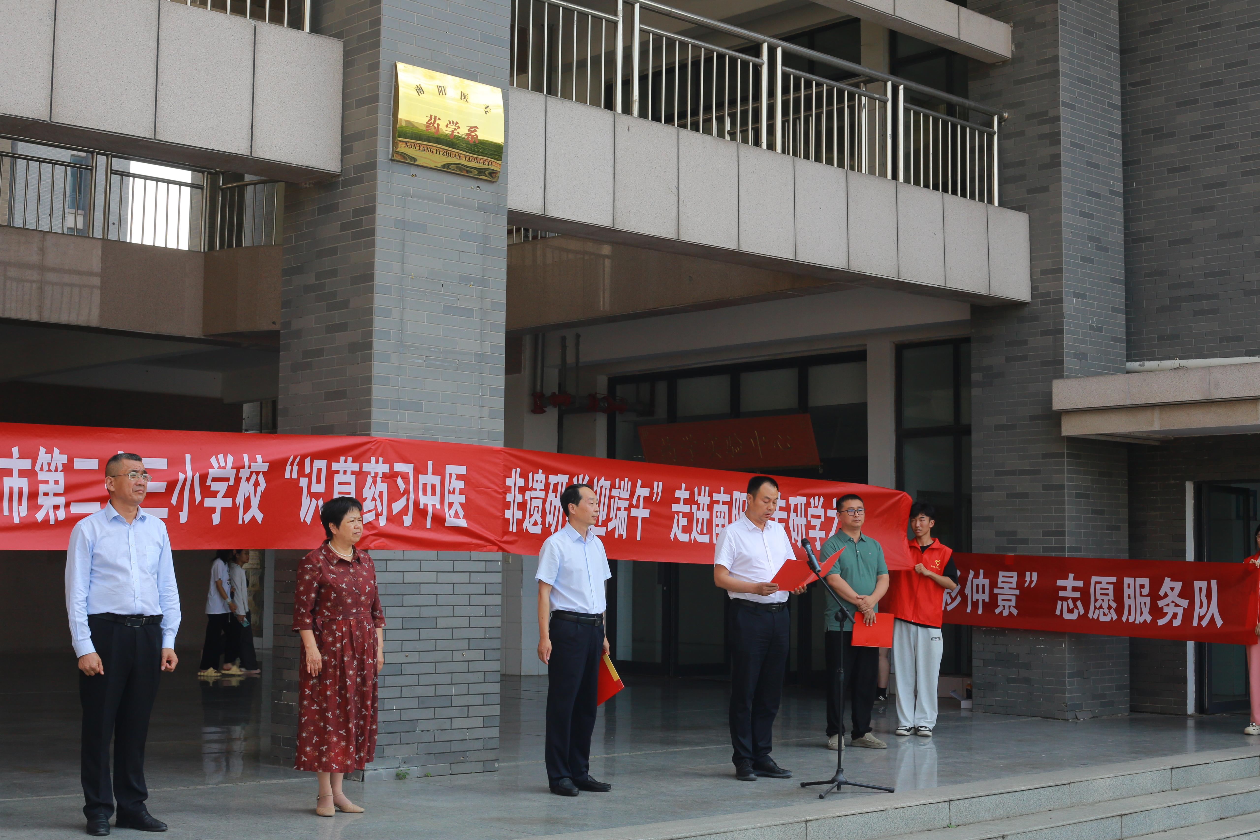 本网讯(文/针灸骨伤系 马驰)6月5日下午,南阳医专与第二十三小学联合开展“仲景文化校园行”暨“识草药习中医,非遗研学迎端午”活动。副校长刘荣志,卧龙区教体局党组成员、体育中心书记褚松军,第二十三小学校长王朋霞、副校长石峰,南阳医专针灸骨伤系副主任李明哲,第二十三小学500余名师生及针灸骨伤系部分师生代表参加活动。
