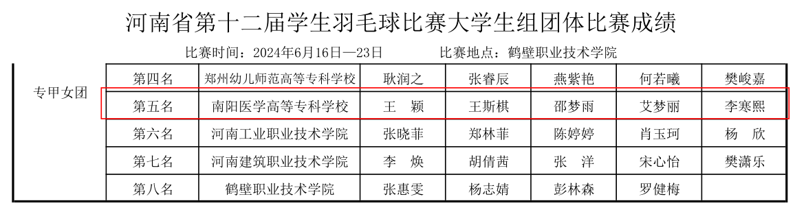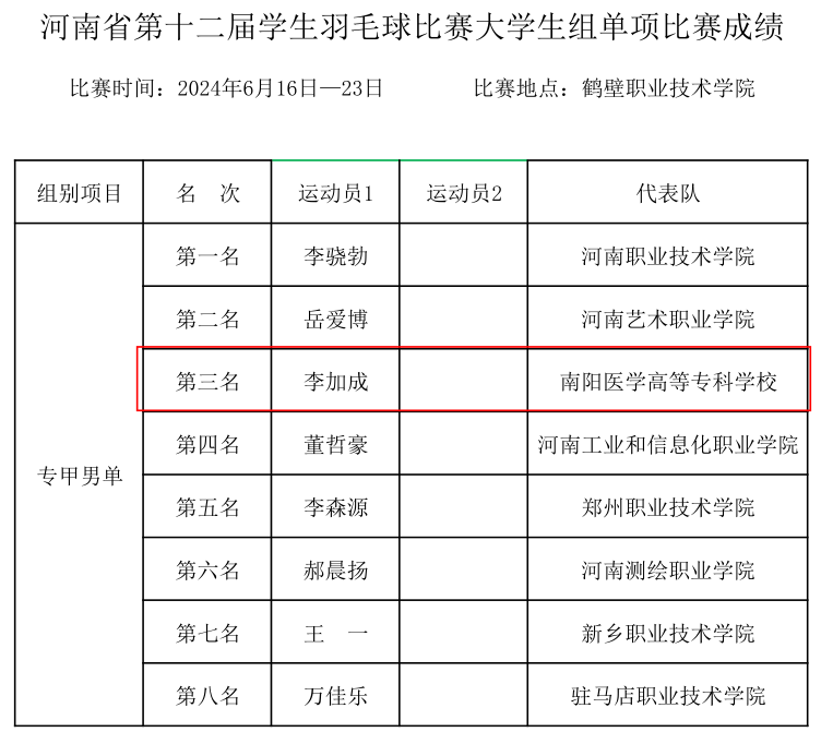 本网讯(文/体教部 李朝)6月16日至23日,河南省高等学校第十二届学生羽毛球比赛在鹤壁市体育馆举行。全省 94 所高校的学生参赛。其中,高职高专院校51所,运动员795名。多盈手机在线登录学生医技系姚乾毅、国际教育学院王梦涛、王中灿、药学系李加成、临床系杨添源组成男子代表队,国际教育学院邵梦雨、护理系王颖、艾梦丽、李寒熙组成女子代表队,分别参加了男女团体和各个单项比赛。