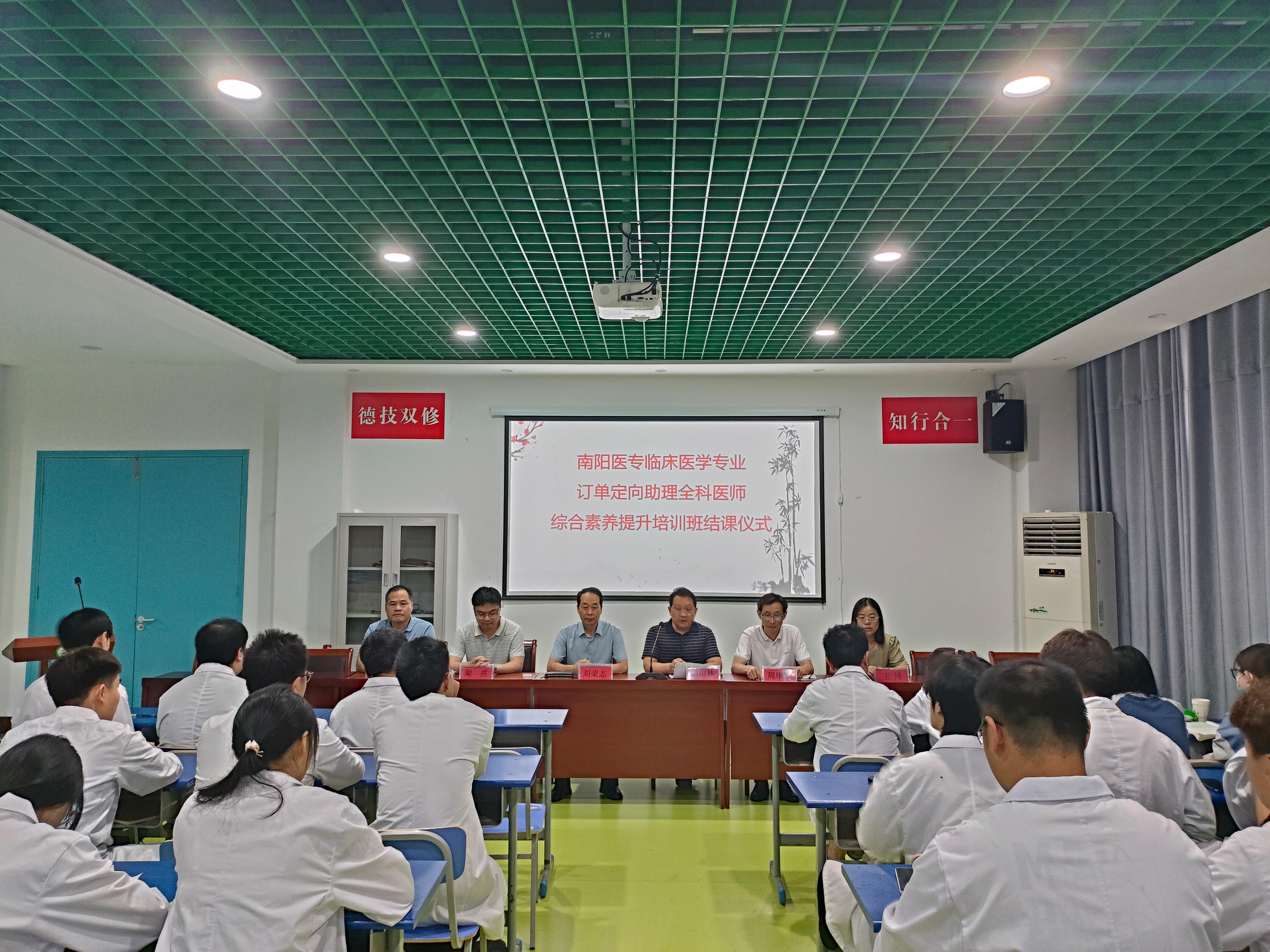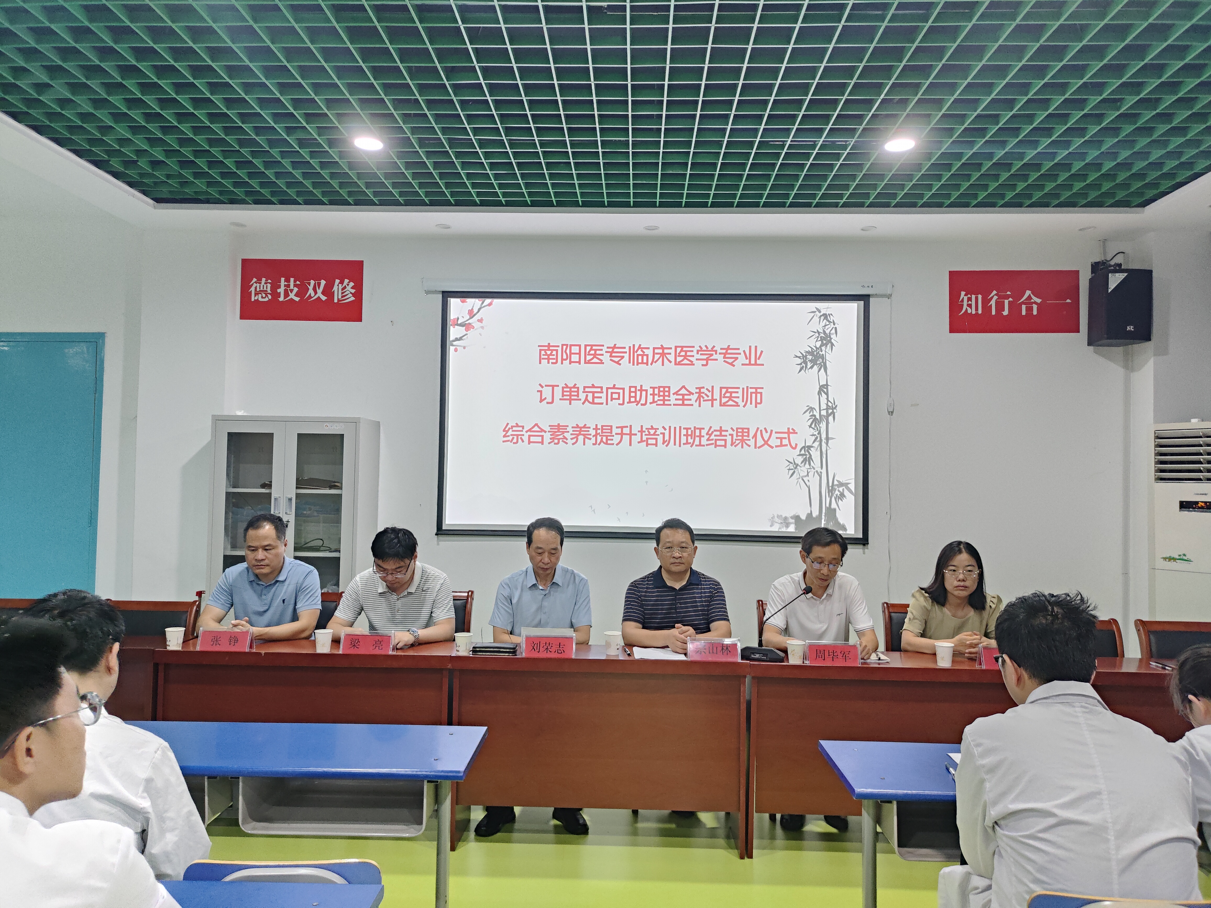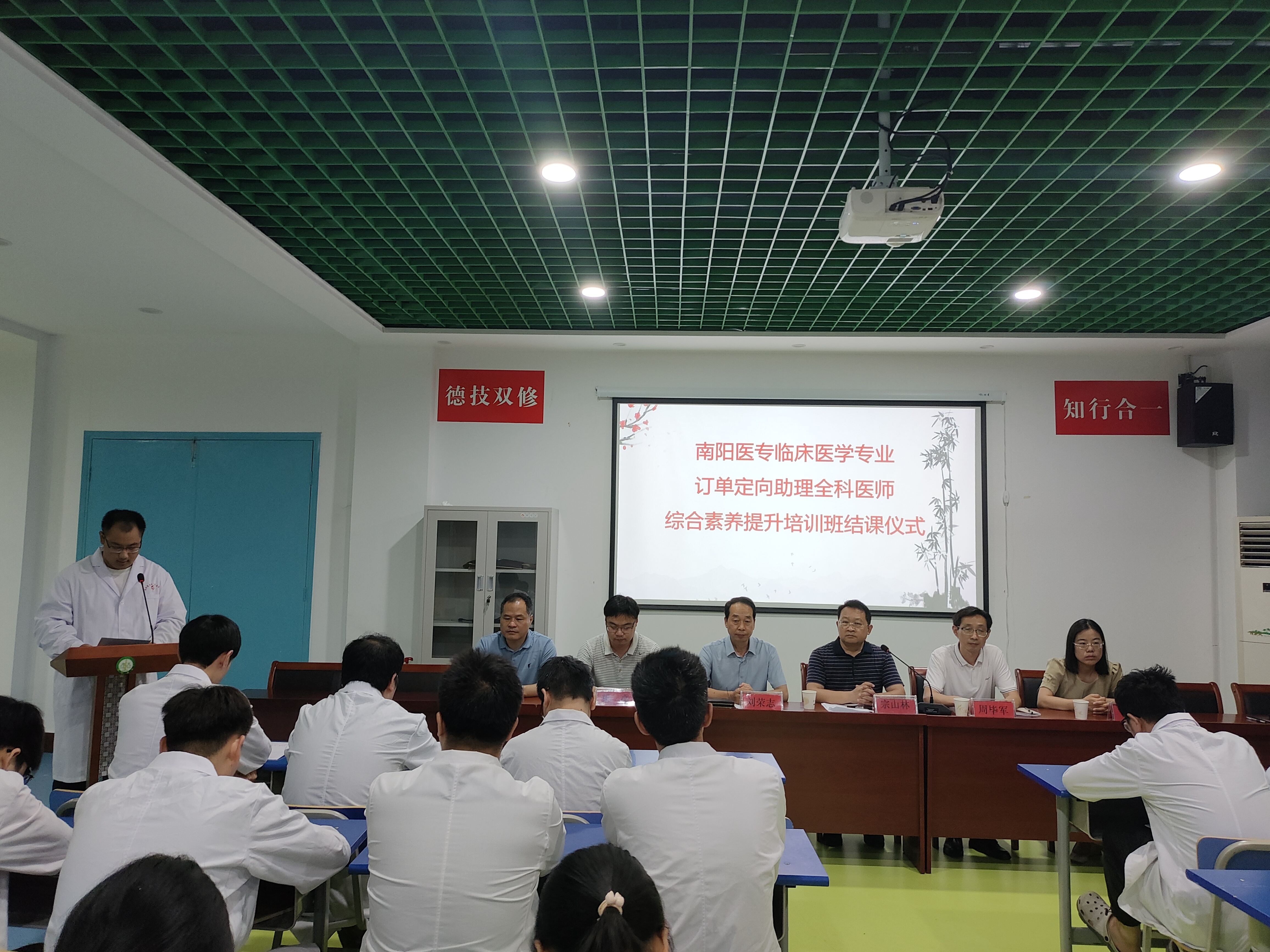 本网讯(文/临床系 李雨鹤)6月21日上午,南阳医专临床医学专业订单定向助理全科医师第一期综合素养提升培训班的课程圆满完成,结课仪式在实验楼一楼临床医学模拟中心举行。副校长刘荣志,教务处副处长梁亮,临床医学系领导班子成员以及第一期订单定向班全体学员参加结课仪式。结课仪式由临床医学系党总支书记宗山林主持。