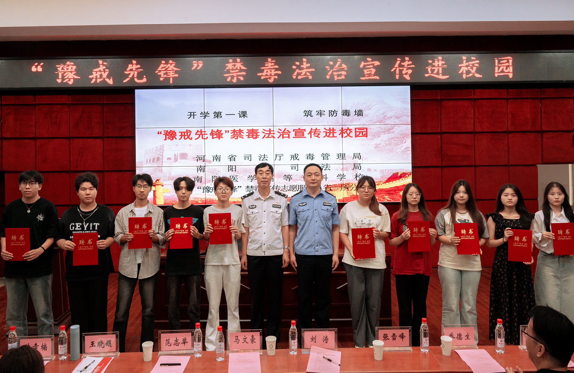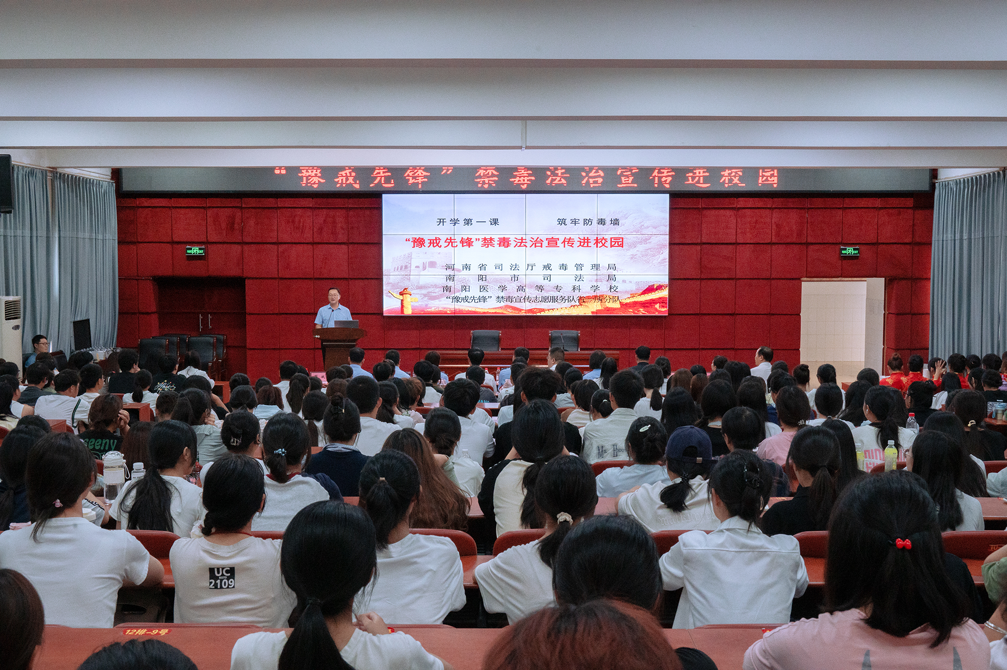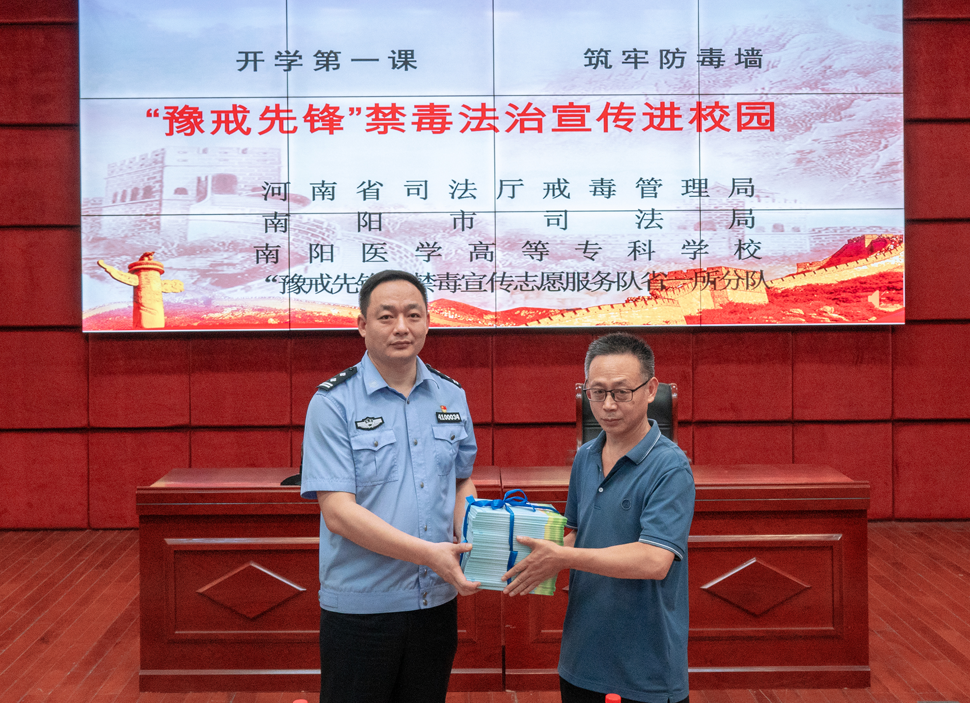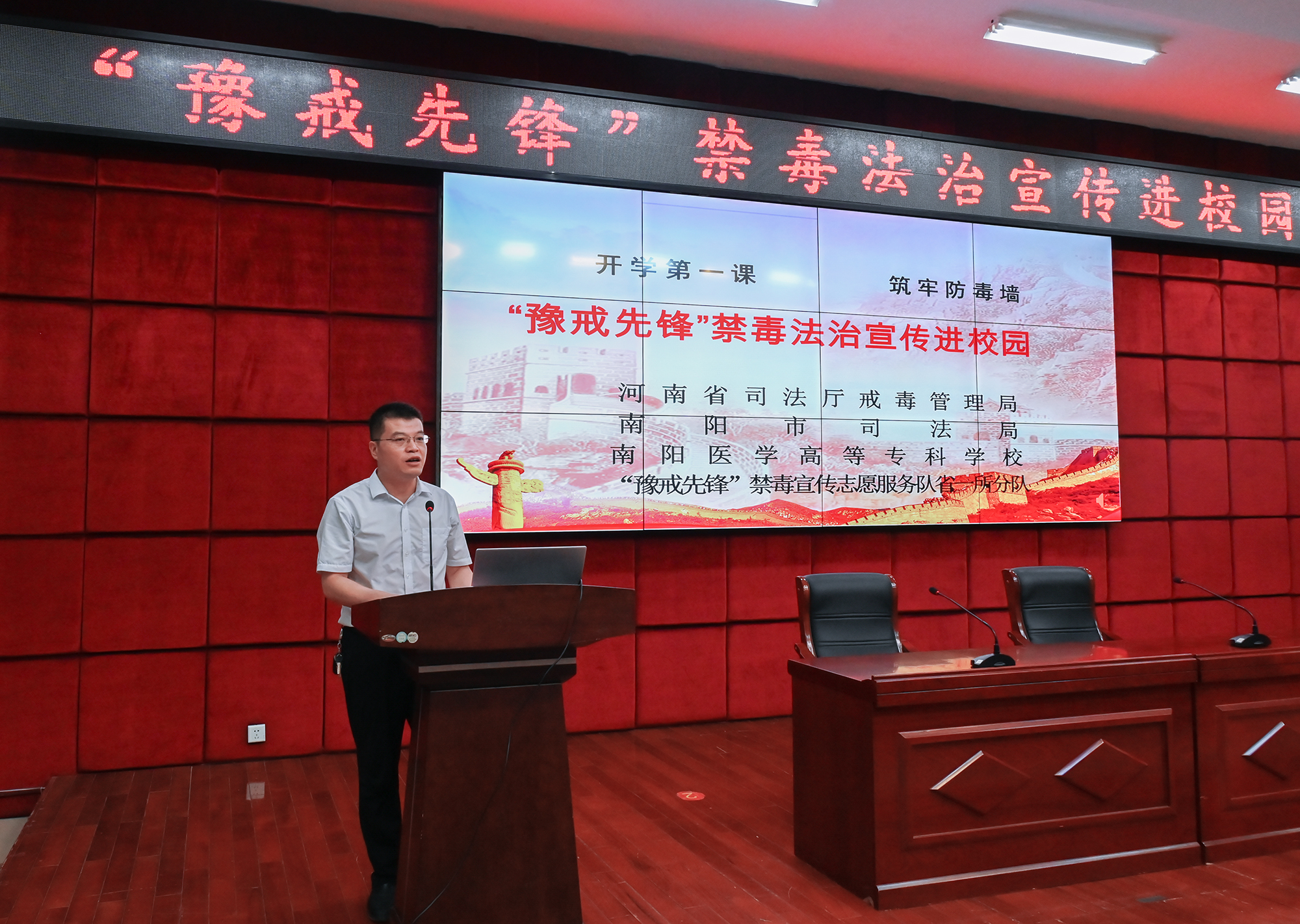 本网讯(文/法制办 刘一凡)为深入贯彻实施《中华人民共和国禁毒法》,提高广大师生的禁毒意识,在全体师生中倡导“拒绝毒品,关爱生命”的理念,提高大学生识毒、防毒、拒毒的意识和能力,9月19日,南阳医专邀请“豫戒先锋”禁毒宣传志愿服务队省一所分队走进多盈手机在线登录,为广大师生开展禁毒宣传教育活动。南阳医专党委副书记刘涛出席活动并致欢迎辞。